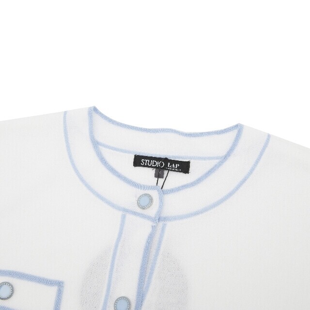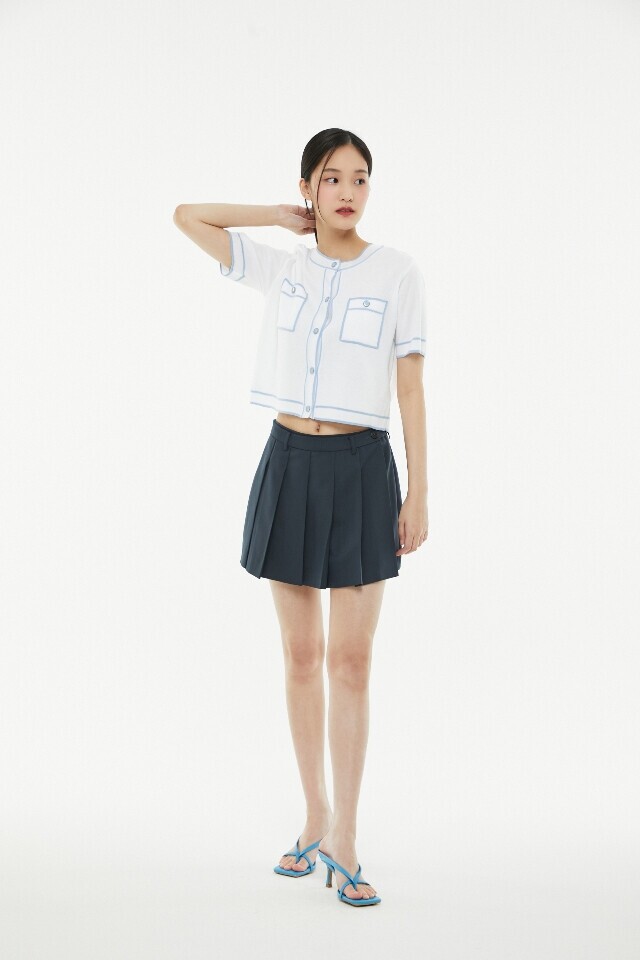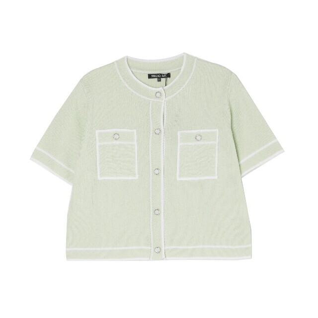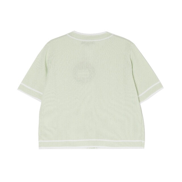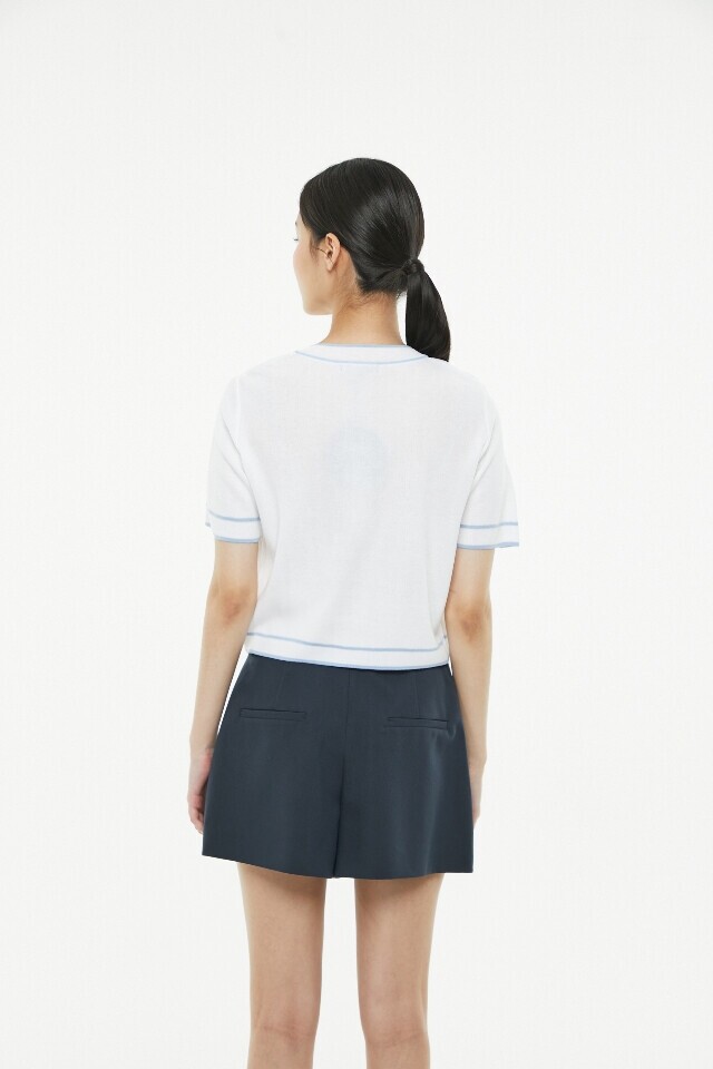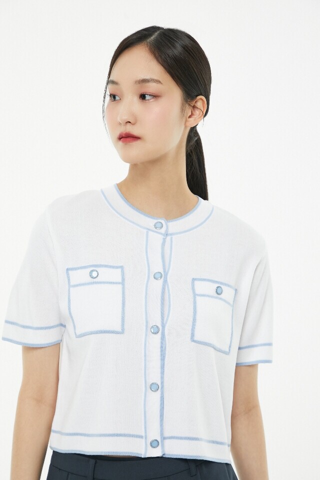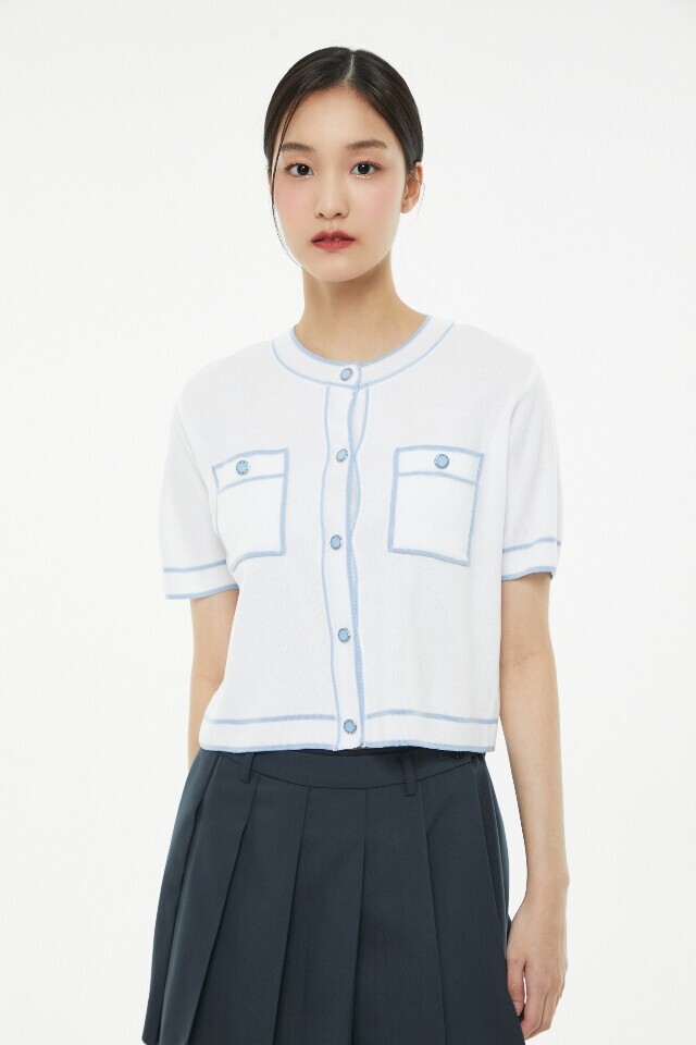 라인 배색 라운드 넥 반팔 가디건 ~