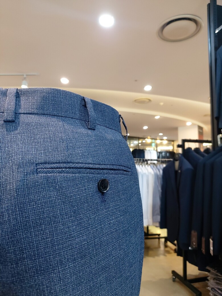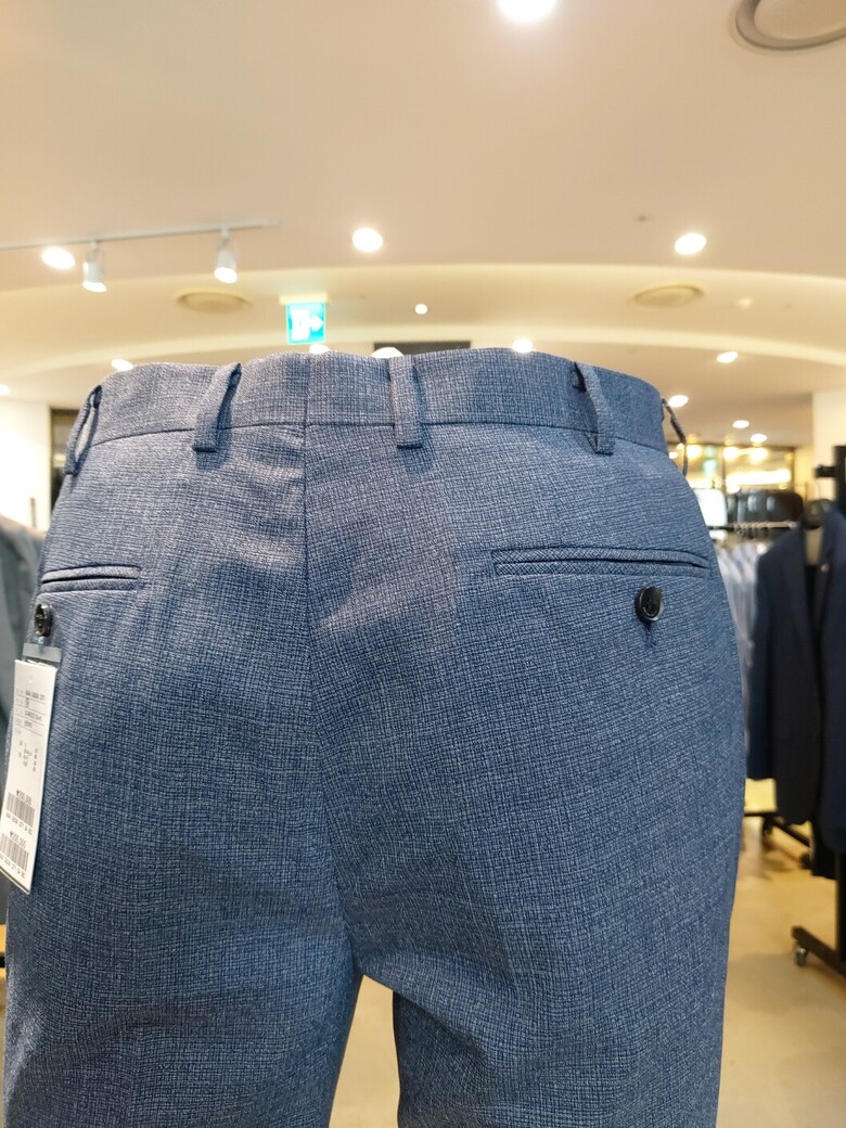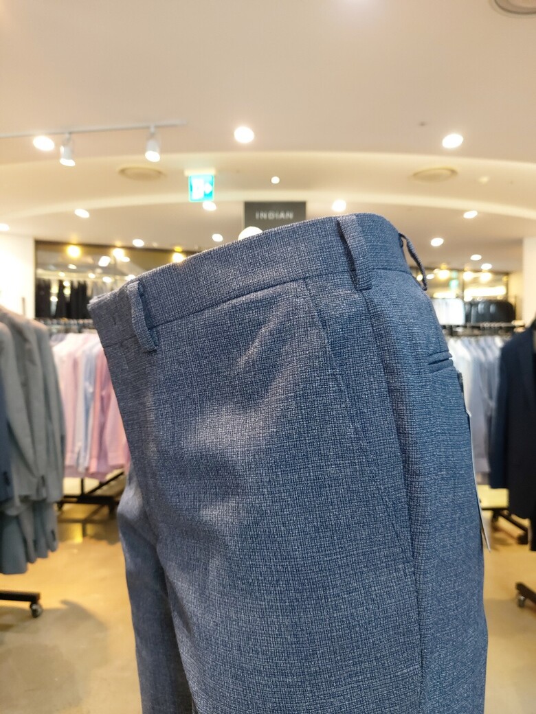 잔체크 있는 그레이쉬 블루색상으로 보기에도 시원해 보이는 색상의 정장팬츠입니다.