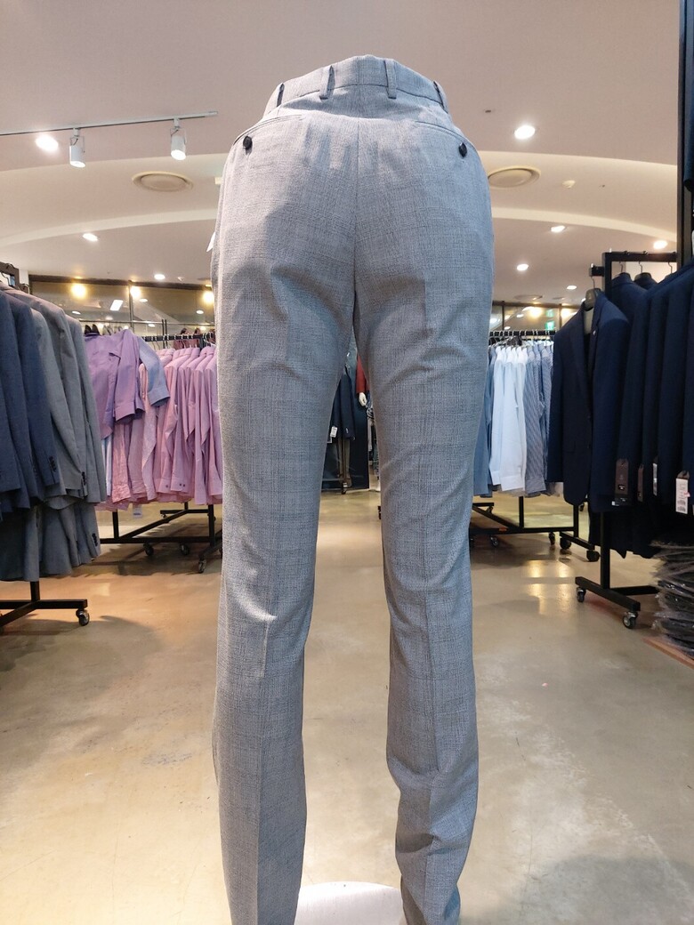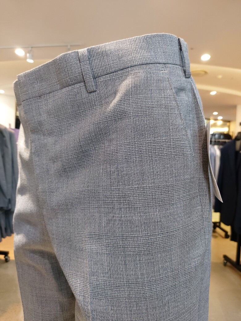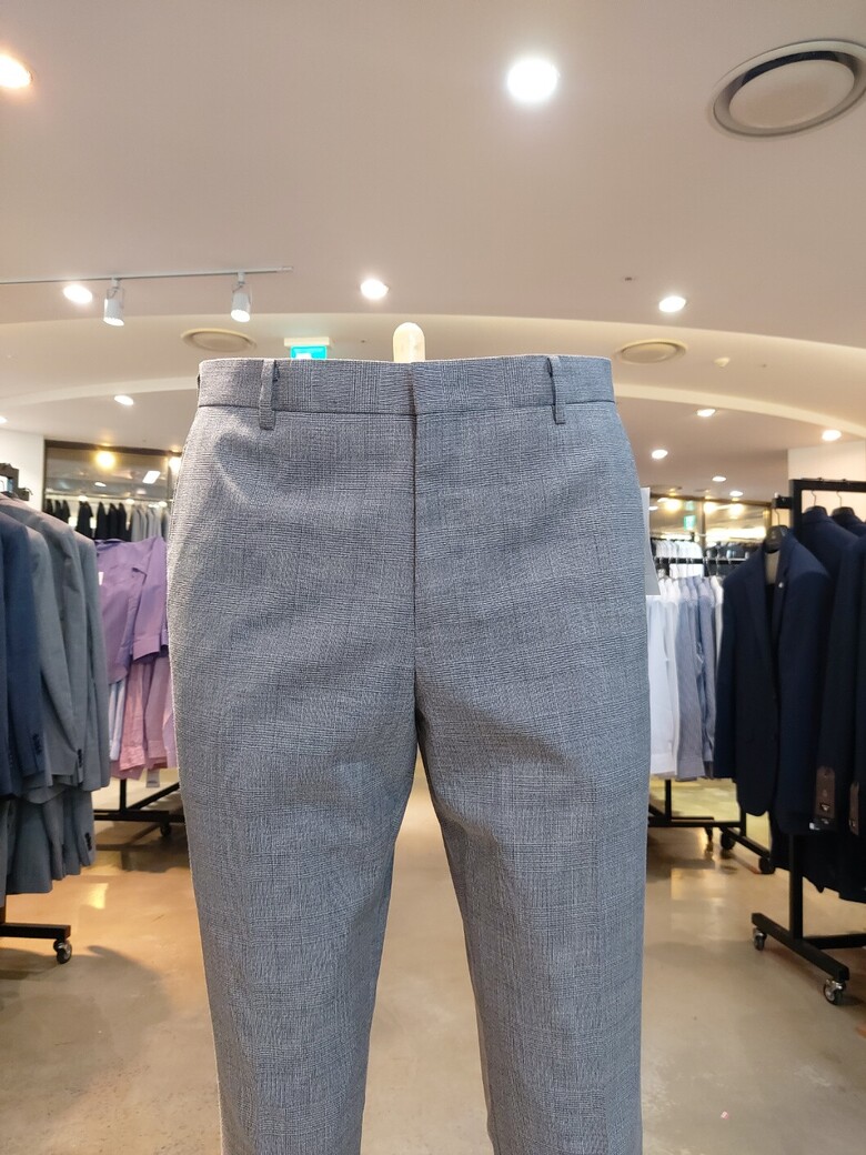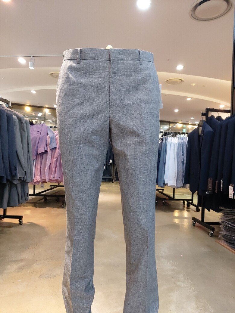 그레이 색상의 잔체크 무늬가 고급스럽고 시원해 보이는 정장팬츠입니다.