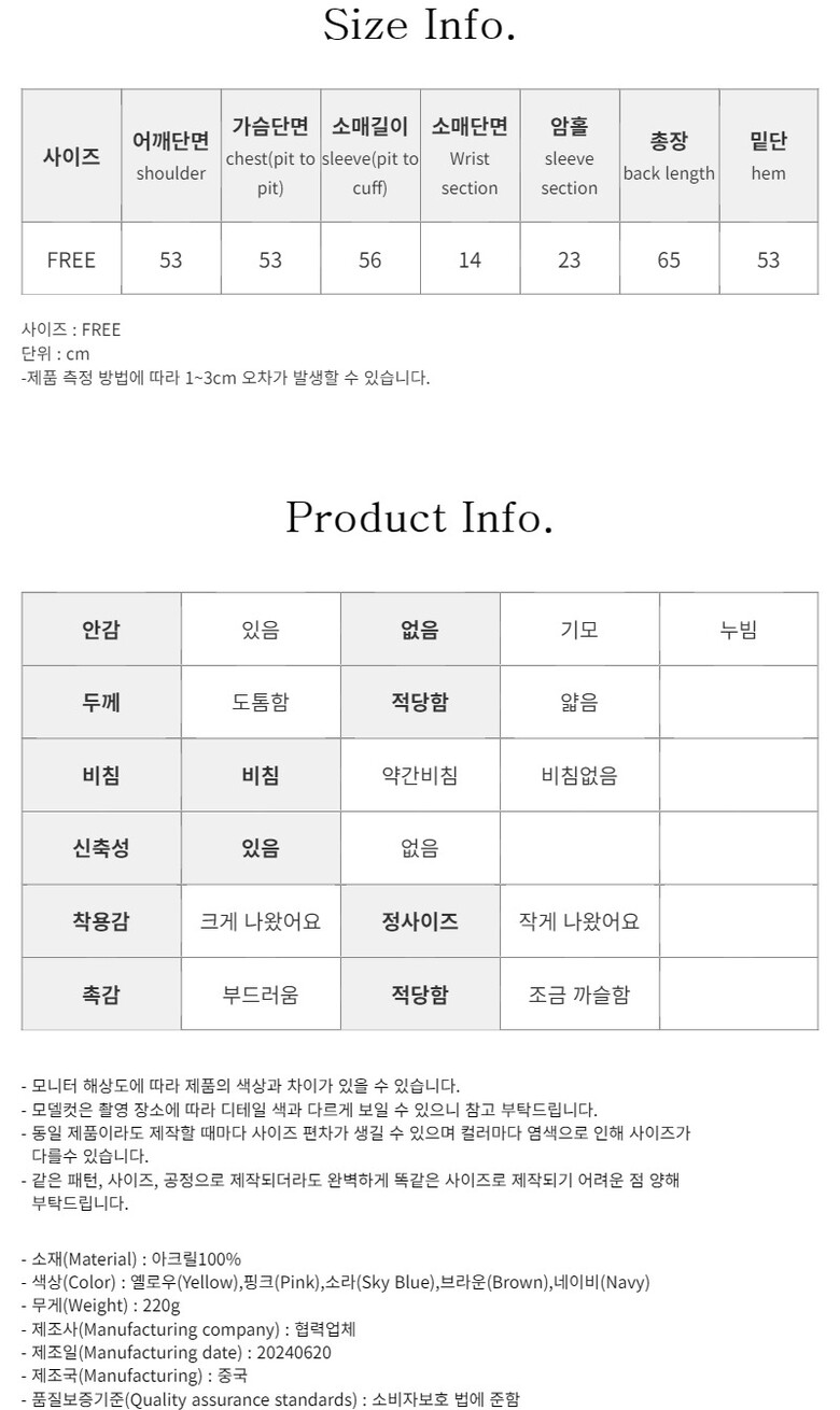 - 안감(없음),촉감(적당함),착용감(정사이즈),신축성(있음),두께감(적당함),비침(있음),사이즈(44~66)