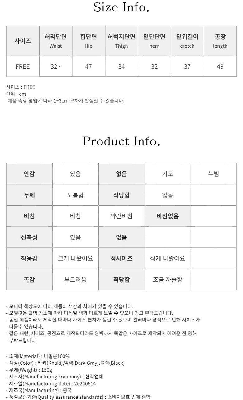 - 안감(없음),촉감(적당함),착용감(정사이즈),신축성(없음),두께감(적당함),비침(없음),사이즈(44~66)