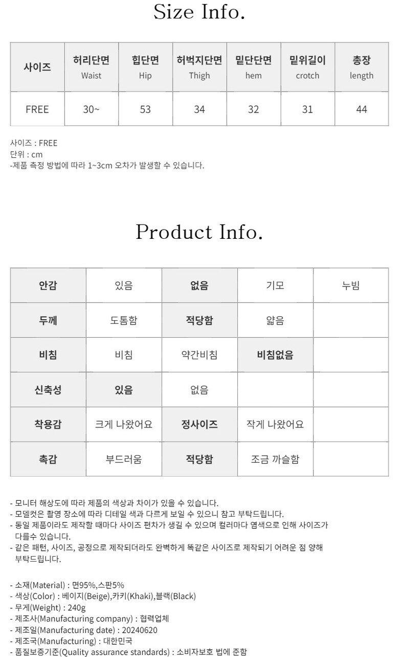 - 안감(없음),촉감(적당함),착용감(정사이즈),신축성(있음),두께감(적당함),비침(없음),사이즈(44~66)
