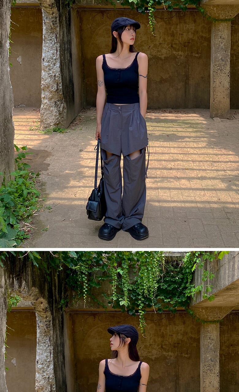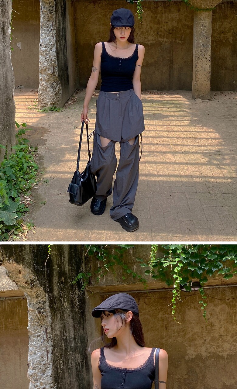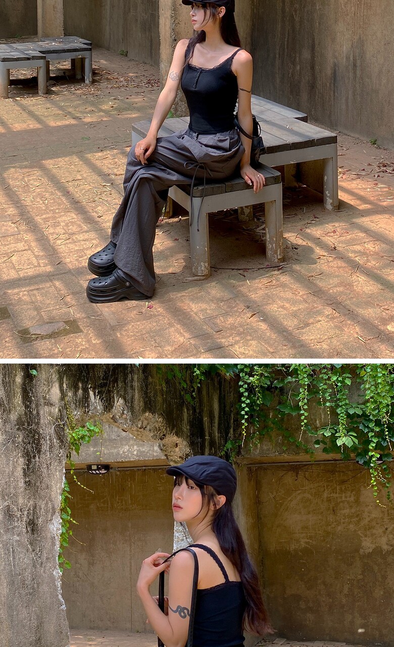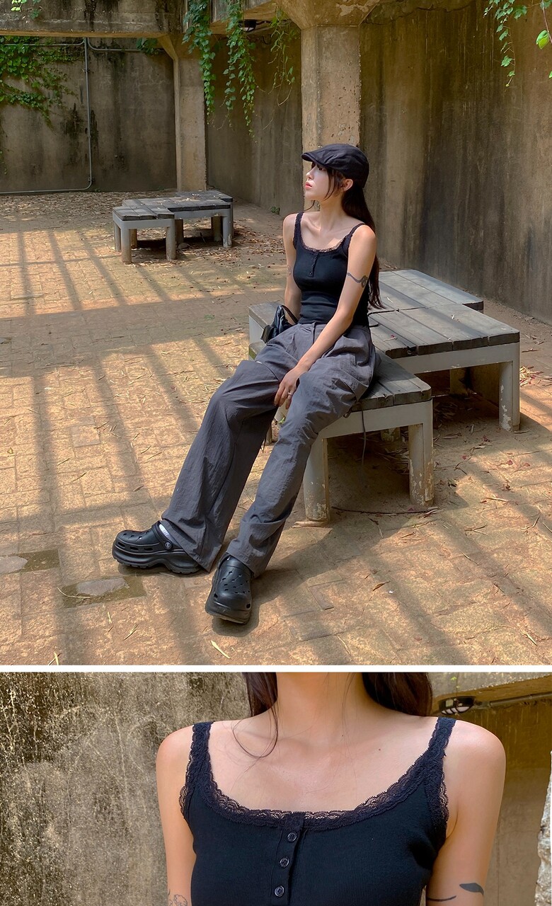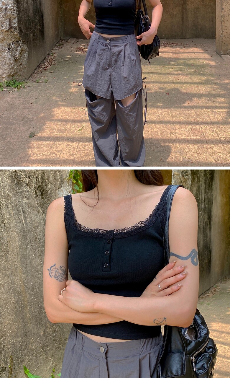 [ 히스카 라운드넥 레이스 끈 단추 디테일 페미닌 캡 나시 ]