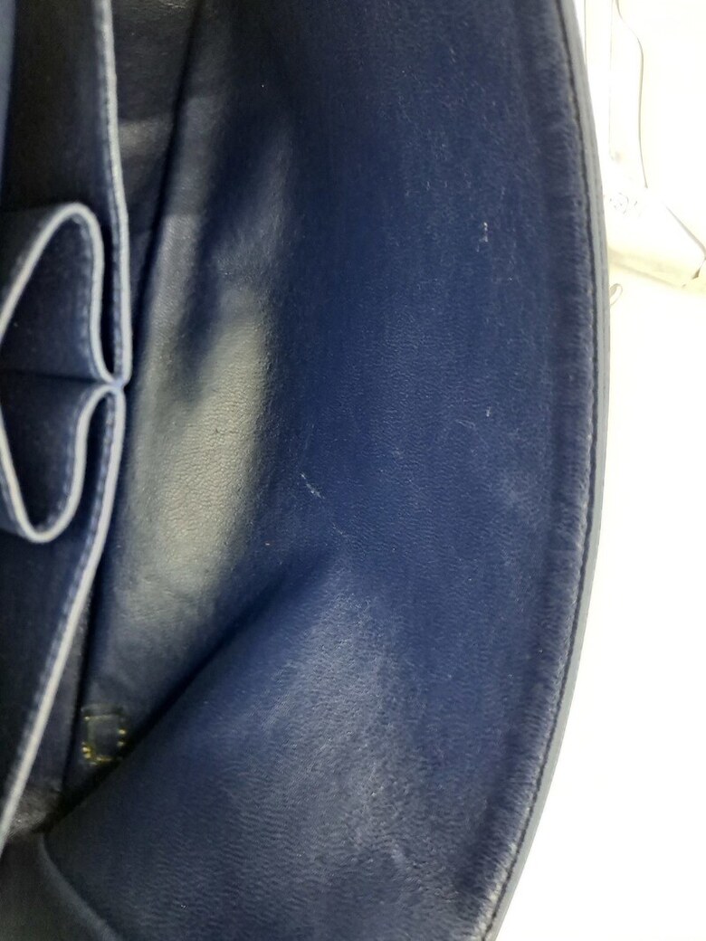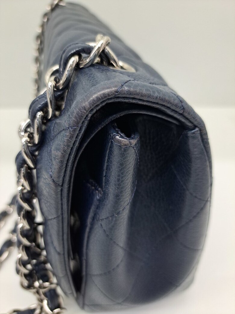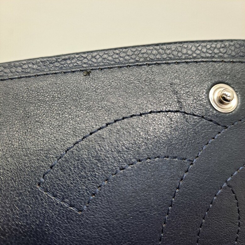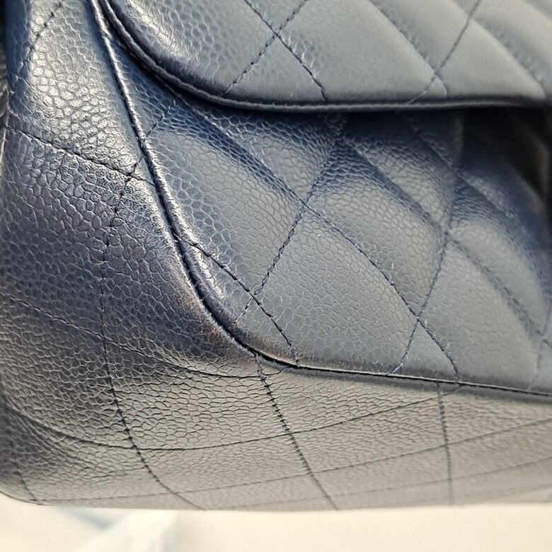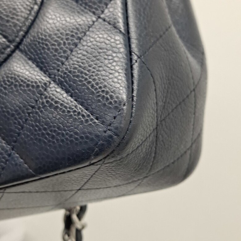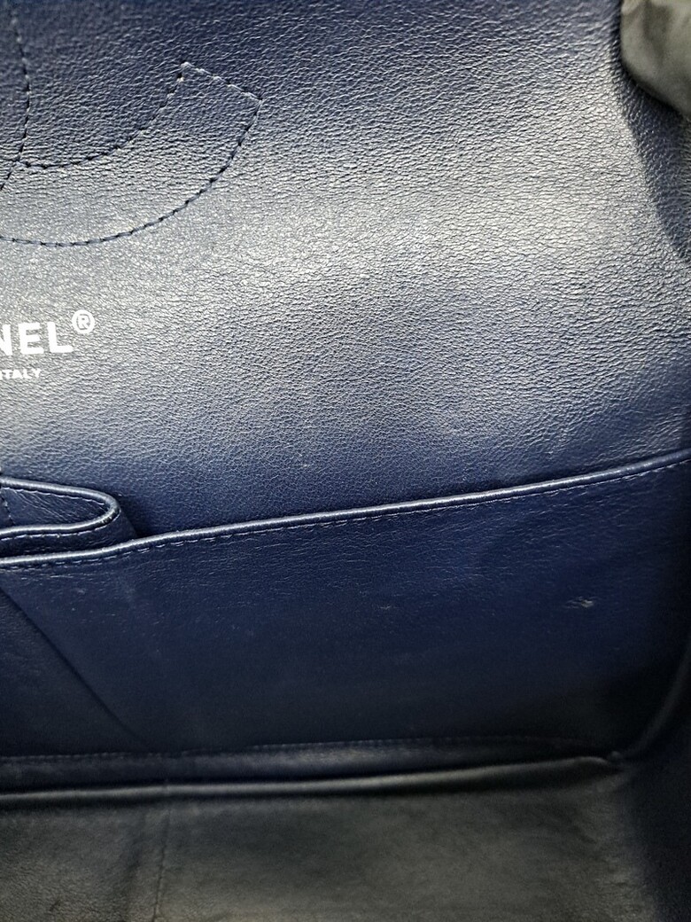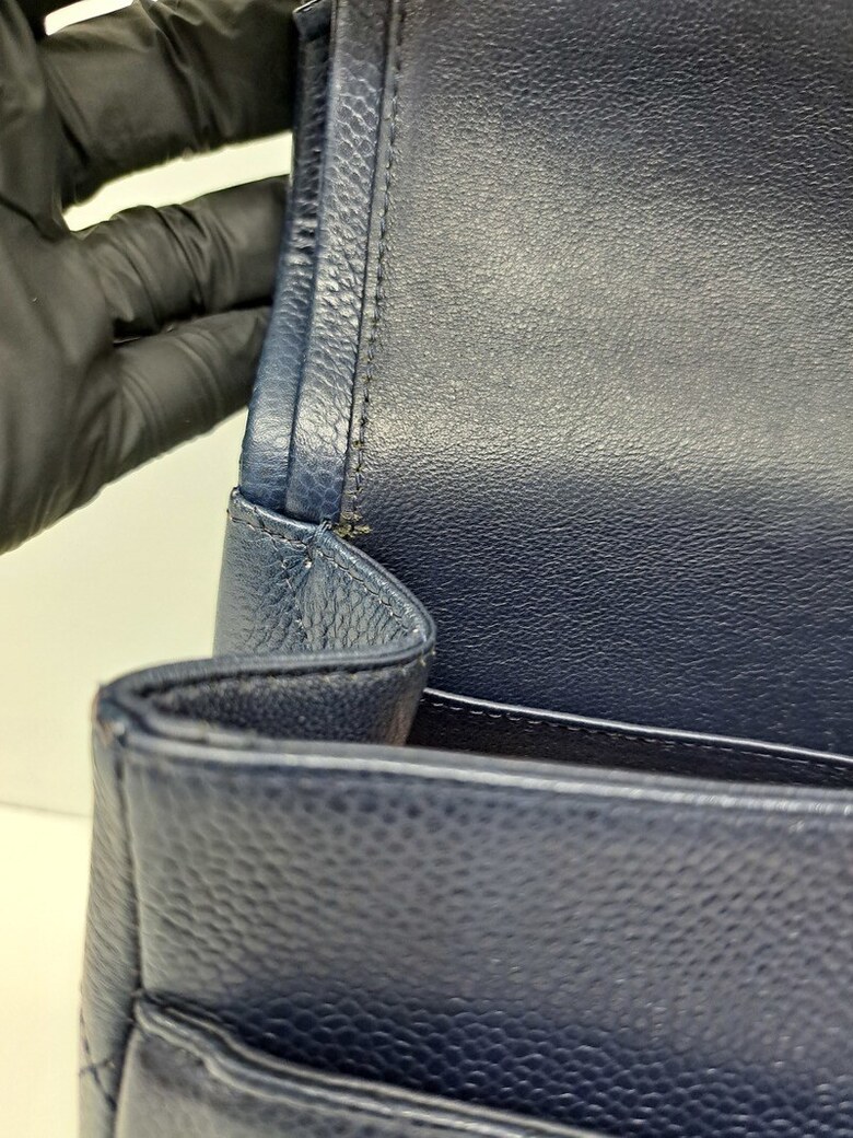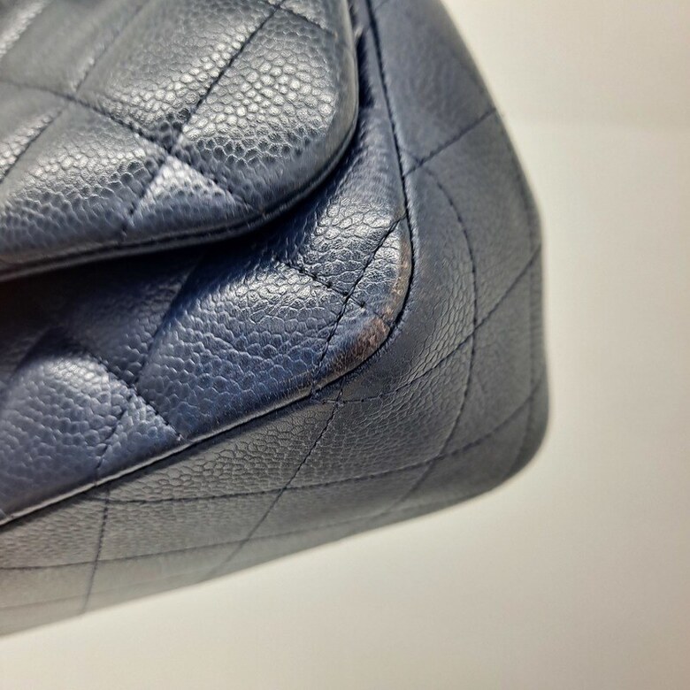 상태 : [ 홀로그램 없는 상품 ], 바디 퀼팅 전체적으로 눌림 및 마모, 바디 부분 얼룩 및 사용감, 밑면 네 곳 모서리 마모 및 상단 양 옆 모서리 마모, 금속 플랩 및 체인 스크래치, 체인스트랩 가죽 마모 및 갈라짐, 내부 사용감으로 인한 스크래치, 내부 플랩 소재 미세 뜯어짐 및 얼룩