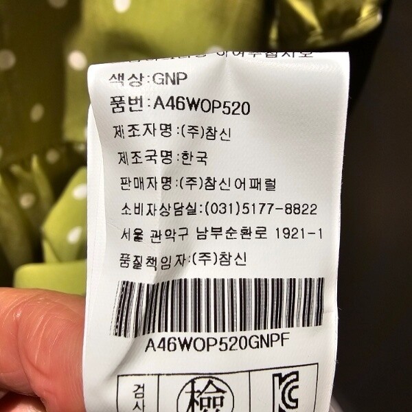 제조자 : (주)참신어패럴