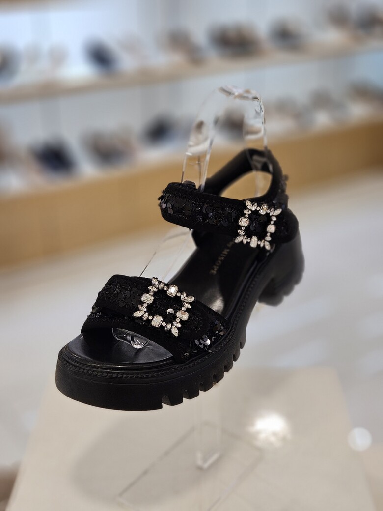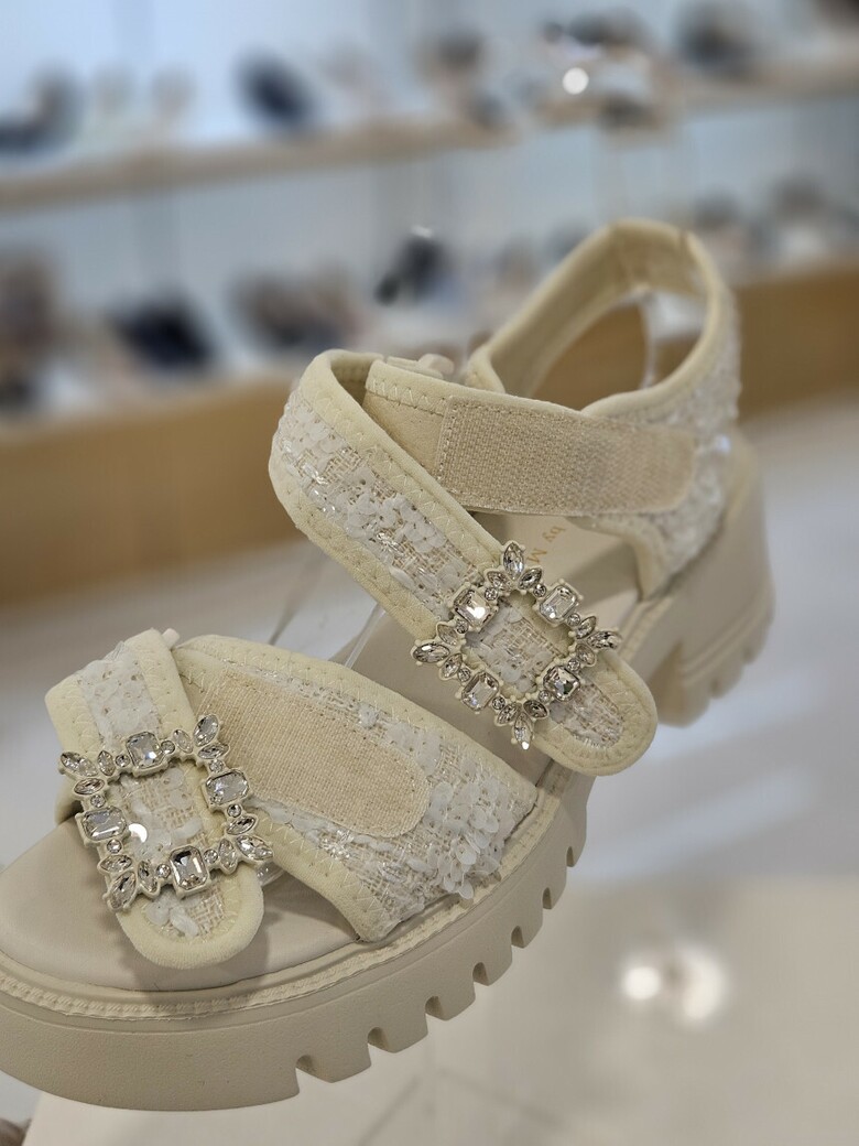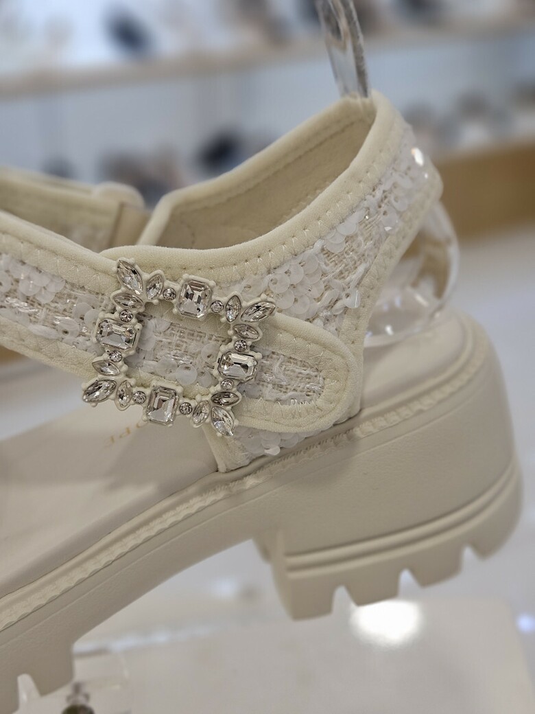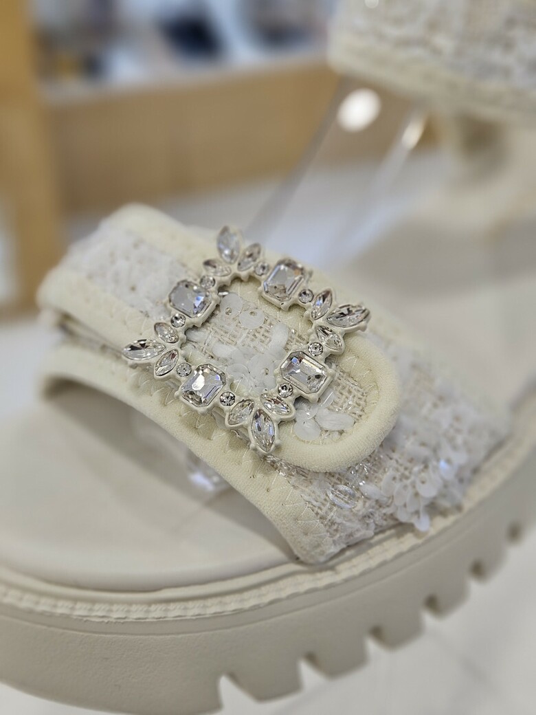 트위드 소재에 보석벨트 장식사용으로 고급스러운 무드가 연출되는 여성 샌들