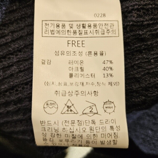 | 1. 제품 소재 (섬유의 조성 또는 혼용률을 백분율로 표시, 기능성인 경우 성적서 또는 허가서) | 겉감 - 레이온47%, 아크릴40%, 폴리에스터13% |