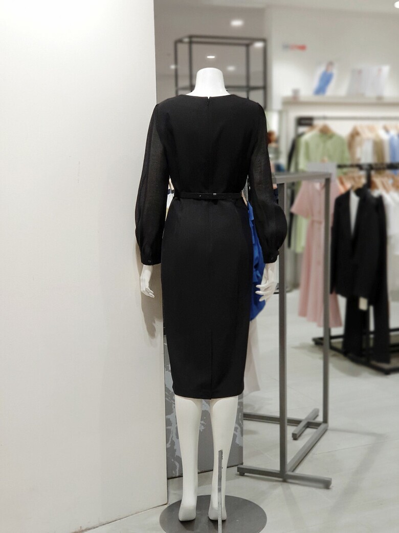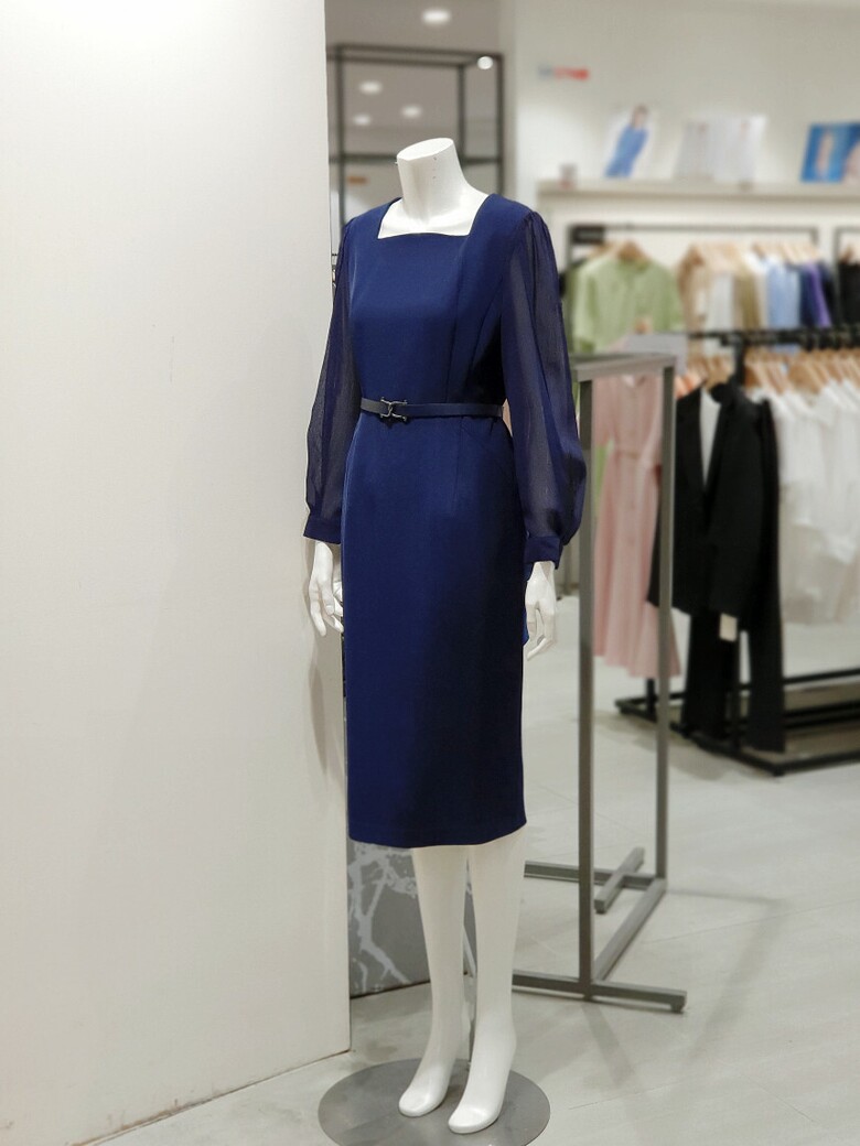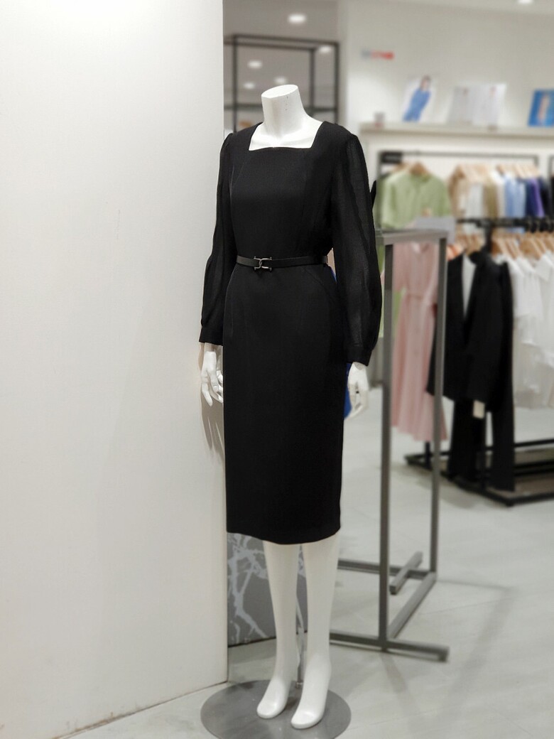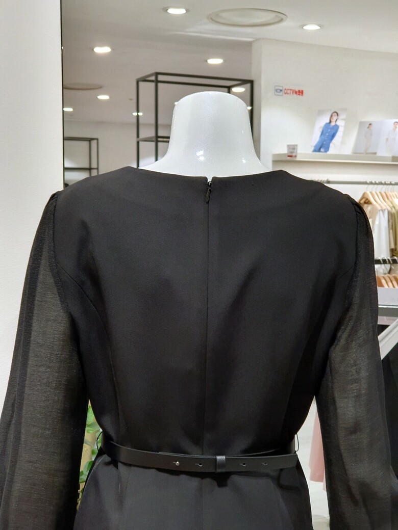 스퀘어 넥 라인에 시스루 슬리브 디테일이 맵시를 더해주며