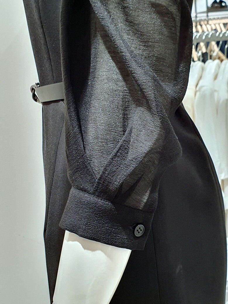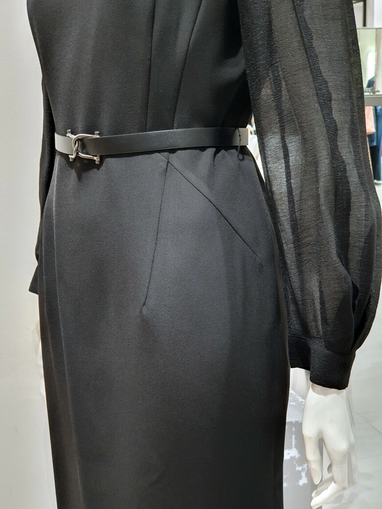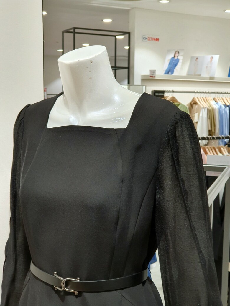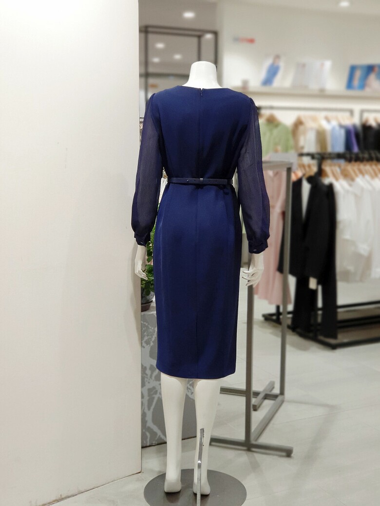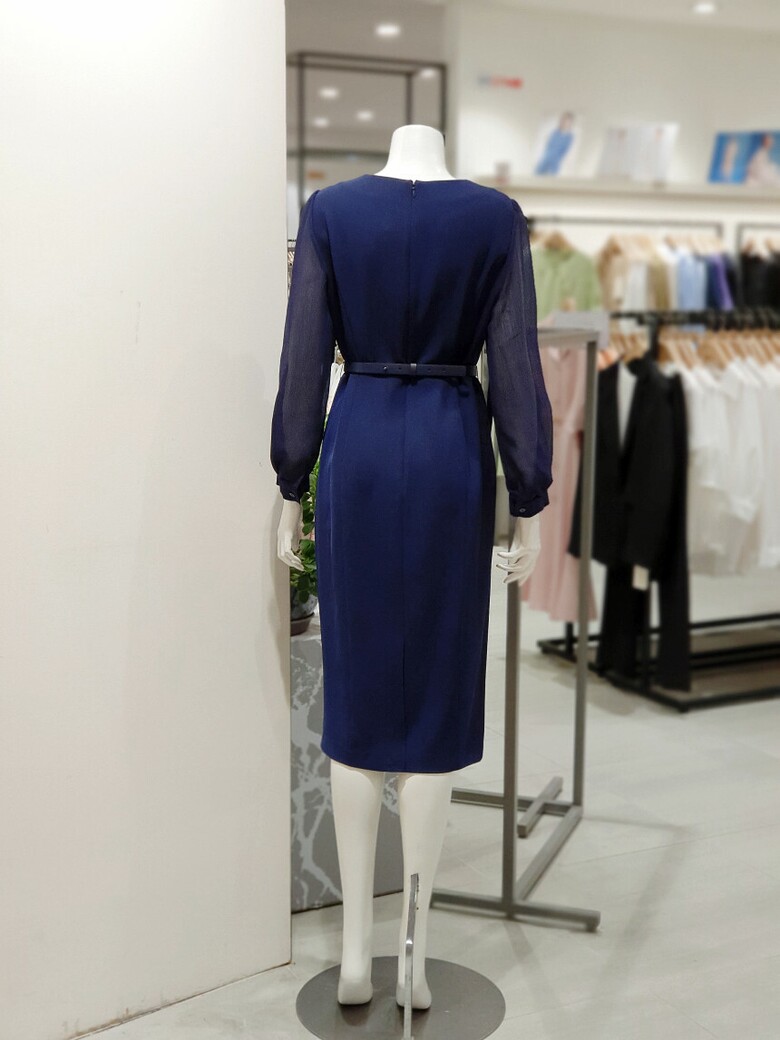 스퀘어 넥 라인에 시스루 슬리브 디테일이 맵시를 더해주며