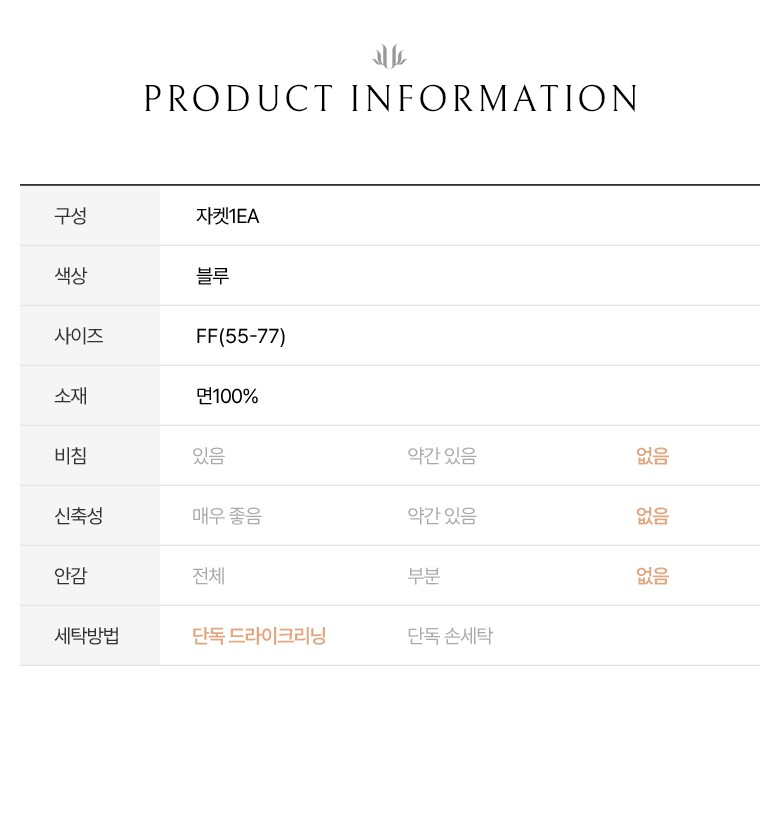 1. 제품 소재 (섬유의 조성 또는 혼용률을 백분율로 표시, 기능성인 경우 성적서 또는 허가서) | 면100% |