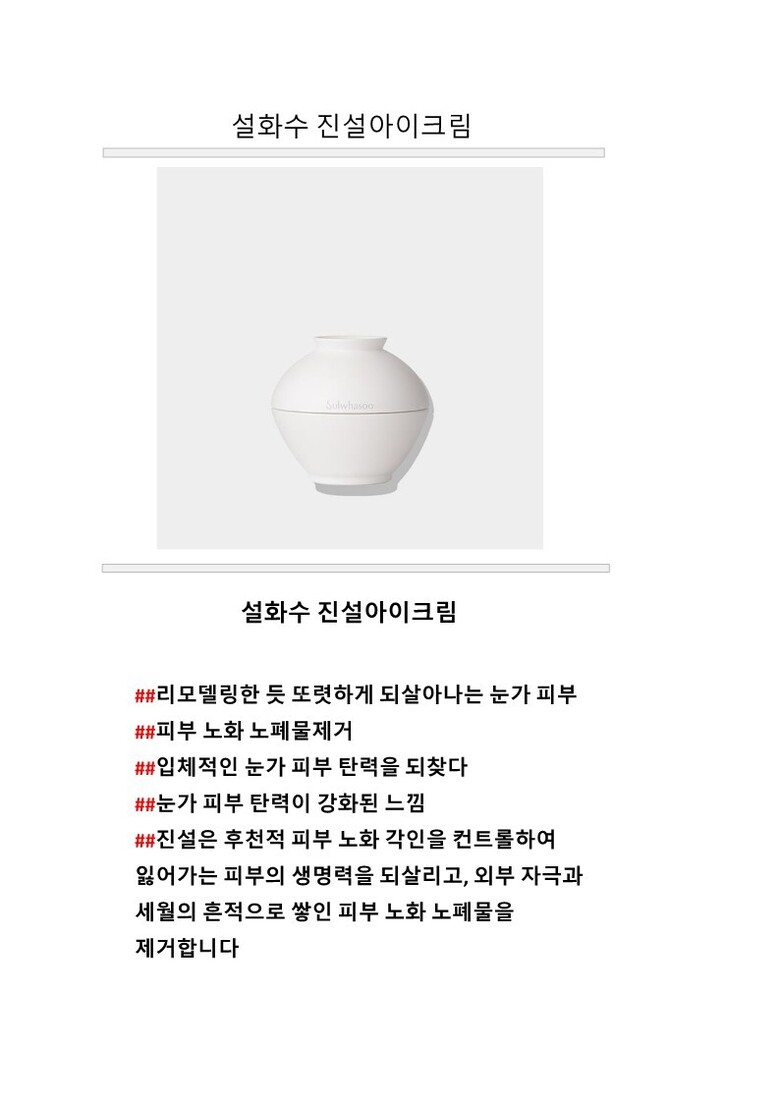 | 7. 주요성분 | 정제수, 프로판디올, 스쿠알란, 백화사설초추출물, 디메치콘, 부틸렌글라이콜, 감초추출물, 메도우폼씨오일, 글리세린, 작약추출물, 연꽃추출물, 옥죽추출물, 마돈나백합비늘줄기추출물, 지황추출물, 꿀, 녹차추출물, 인삼추출물, 하이드롤라이즈드인삼사포닌, 뽕나무뿌리추출물, 쉐어버터, 1, 2-헥산디올, C12-20알킬글루코사이드, C14-22알코올, 글리세릴스테아레이트, 글리세릴카프릴레이트, 라우릭애씨드, 메톡시피이지-114/폴리엡실론카프롤락톤, 미리스틱애씨드, 베헤닐알코올, 스테아릭애씨드, 아라키딜글루코사이드, 아라키딜알코올, 에칠헥실글리세린, 잔탄검, 카보머, 카프릴릴글라이콜, 트로메타민, 팔미틱애씨드, 하이드로제네이티드레시틴, 디소듐이디티에이, 페녹시에탄올, 향료, 제라니올, 시트랄, 리날룰, 시트로넬올, 리모넨 확인 |