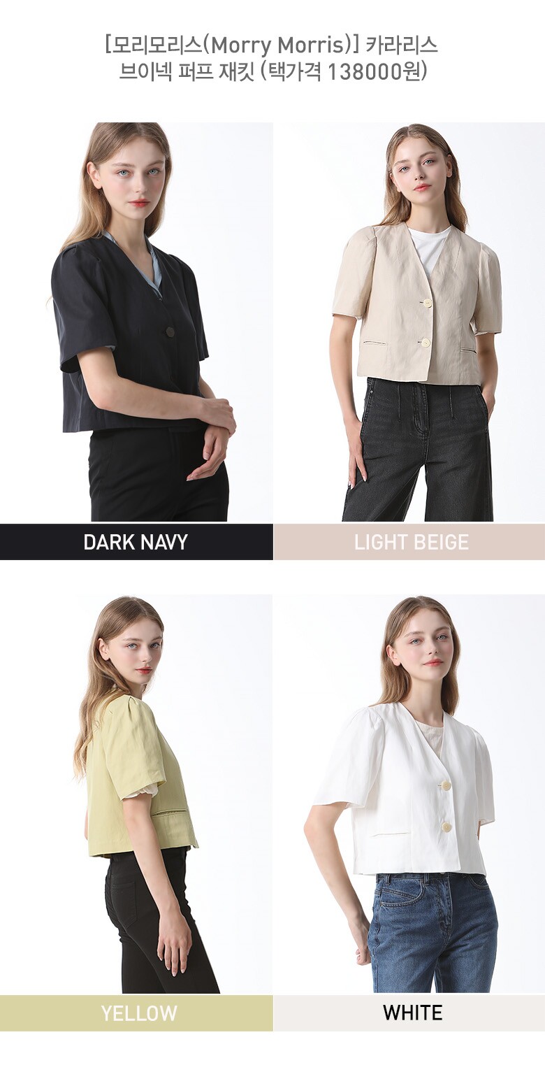 ▶ ITEM : 카라리스 브이넥 퍼프 재킷 ▶ NUMBER : MAWWJKM21160 ▶ FABRIC : [겉감] 레이온 52%, 마 28%, 면 20% ▶ WASHING : 단독드라이(이염.필링.고온건조 다림질불가) ▶ 원 산 지 : 베 트 남 ▶ 색 상 : 라이트베이지(LB),다크네이비(DN),옐로우(YE),오프화이트(OW)