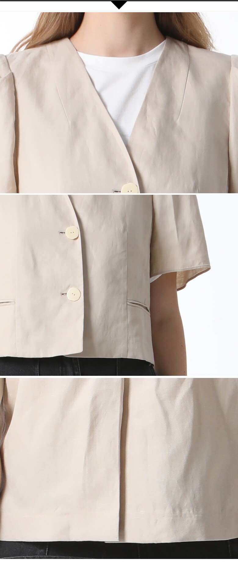 퍼프 슬리브로 포인트를 준 린넨 블렌드 칼라리스 브이넥 재킷입니다. 브랜드만의 고급소재로 편안하고 우수한 착용감을 선사합니다. 깔끔하고 심플한 디자인으로 다양한 하의와 매치하기 좋으며 오피스룩, 데일리룩으로 활용하기 좋은 아이템입니다.