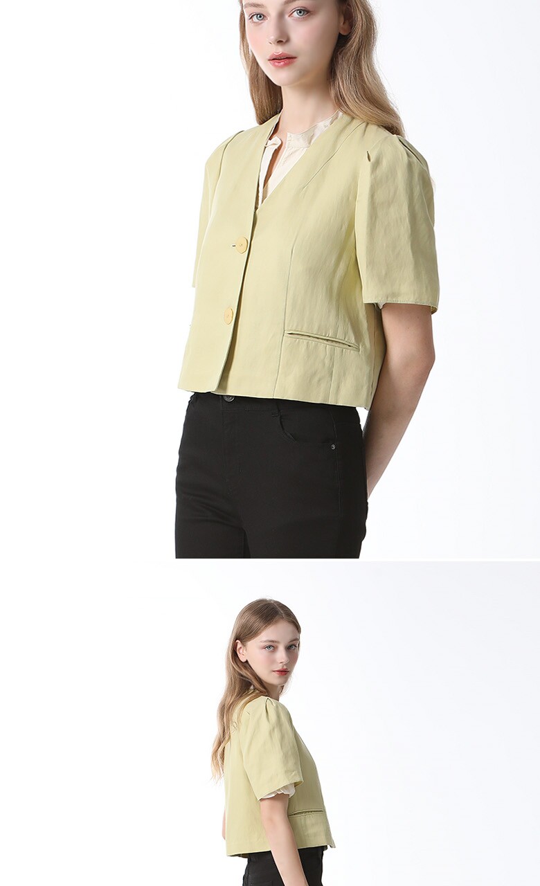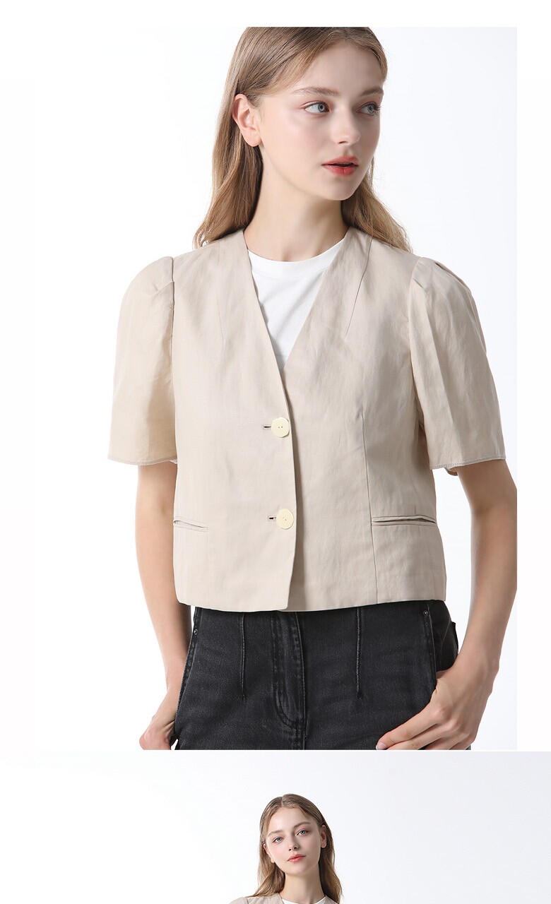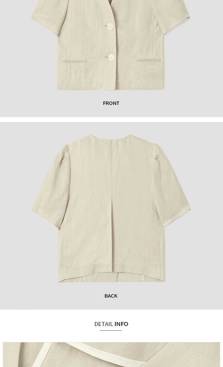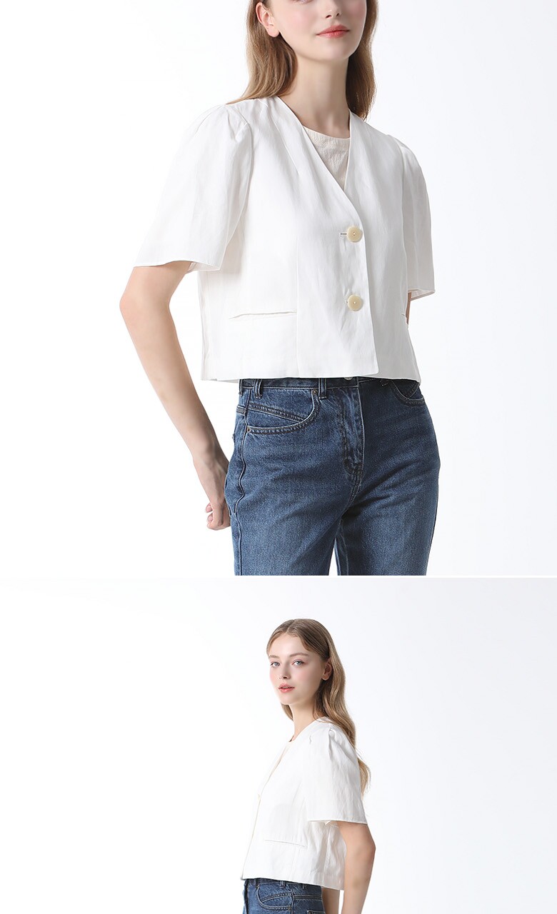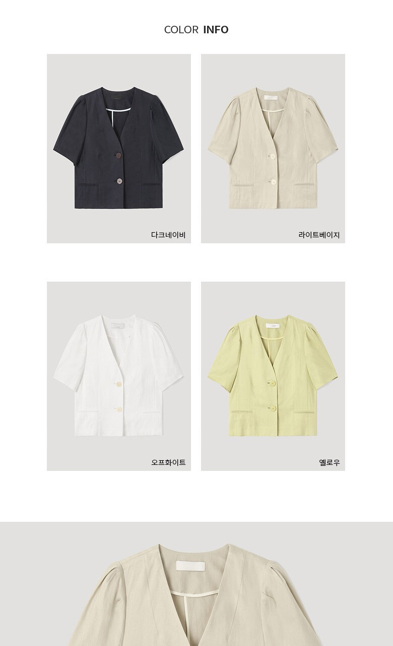 퍼프 슬리브로 포인트를 준 린넨 블렌드 칼라리스 브이넥 재킷입니다. 브랜드만의 고급소재로 편안하고 우수한 착용감을 선사합니다. 깔끔하고 심플한 디자인으로 다양한 하의와 매치하기 좋으며 오피스룩, 데일리룩으로 활용하기 좋은 아이템입니다.