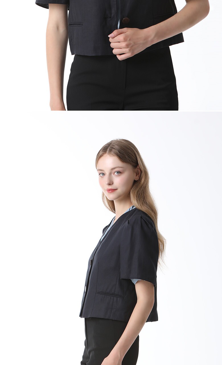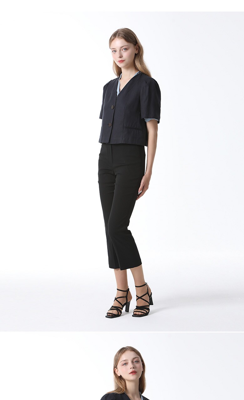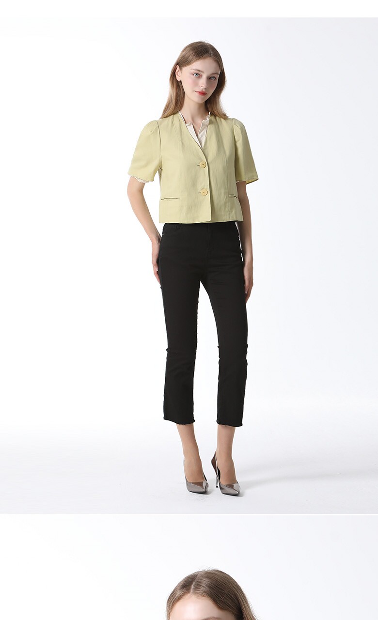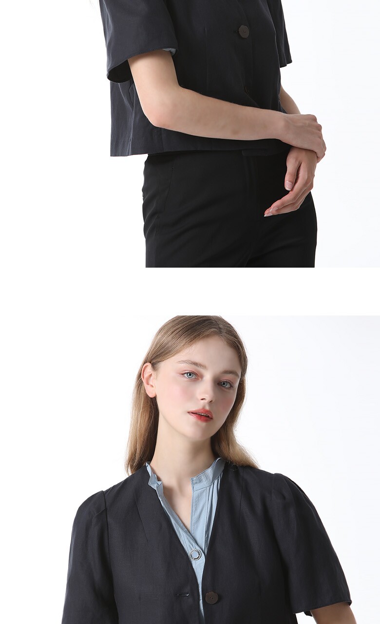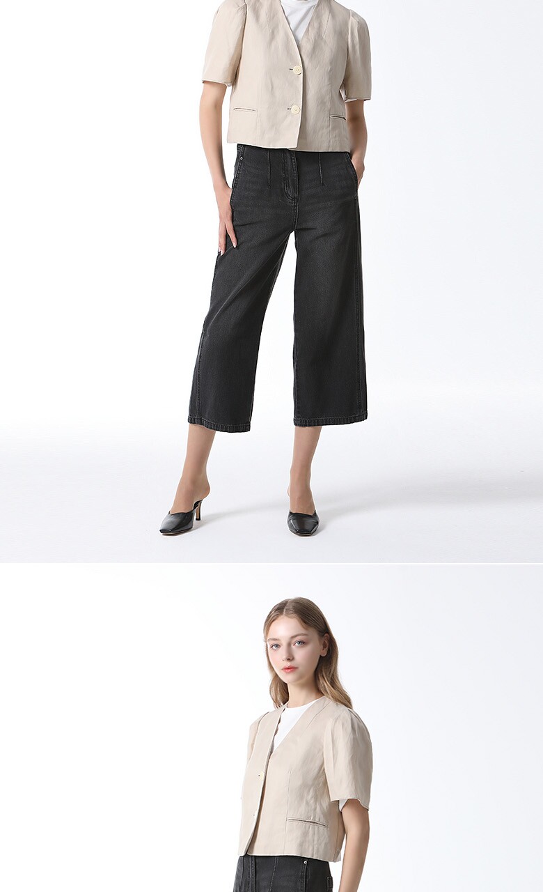 퍼프 슬리브로 포인트를 준 린넨 블렌드 칼라리스 브이넥 재킷입니다. 브랜드만의 고급소재로 편안하고 우수한 착용감을 선사합니다. 깔끔하고 심플한 디자인으로 다양한 하의와 매치하기 좋으며 오피스룩, 데일리룩으로 활용하기 좋은 아이템입니다.