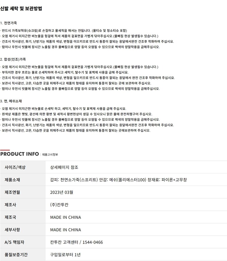| 1. 제품 소재 (운동화인 경우에는 겉감, 안감을 구분하여 표시) | 상세페이지 참조 |