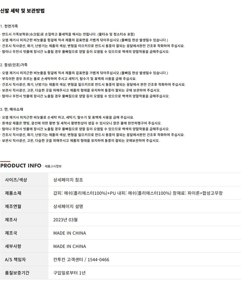 1. 제품 소재 (운동화인 경우에는 겉감, 안감을 구분하여 표시) | 상세페이지 참조 |