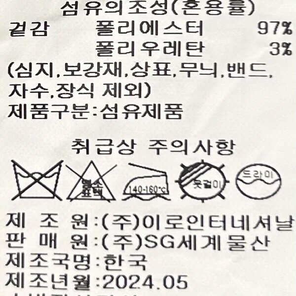 | 1. 제품 소재 (섬유의 조성 또는 혼용률을 백분율로 표시, 기능성인 경우 성적서 또는 허가서) | 겉감-폴리에스터97% 폴리우레탄3% |