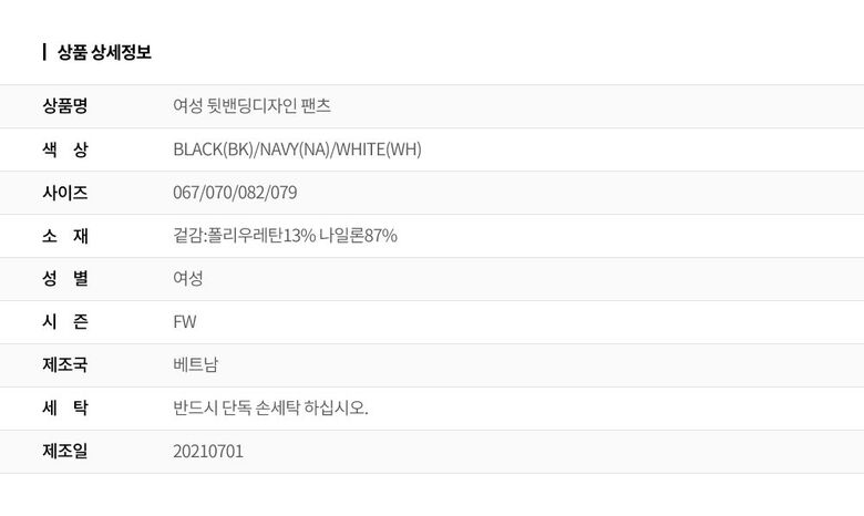 1. 제품 소재 (섬유의 조성 또는 혼용률을 백분율로 표시, 기능성인 경우 성적서 또는 허가서) | 겉감:폴리우레탄13% 나일론87% |