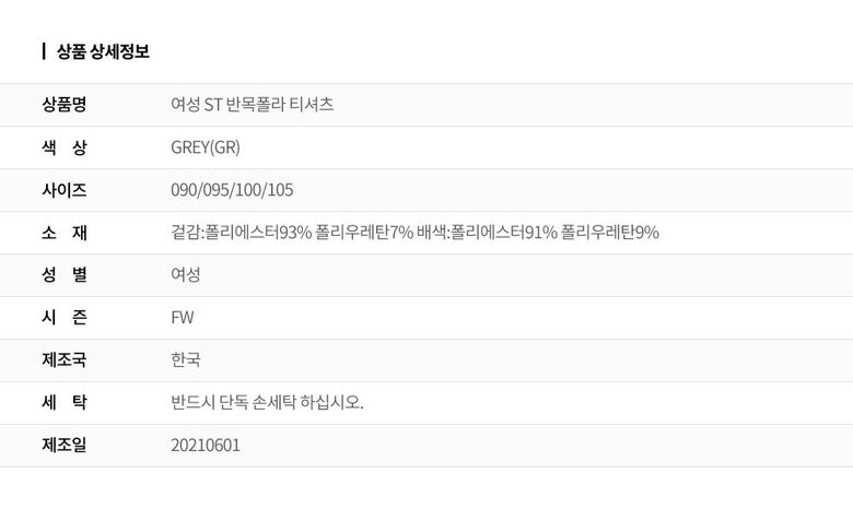 1. 제품 소재 (섬유의 조성 또는 혼용률을 백분율로 표시, 기능성인 경우 성적서 또는 허가서) | 겉감:폴리에스터93% 폴리우레탄7% 배색:폴리에스터91% 폴리우레탄9% |