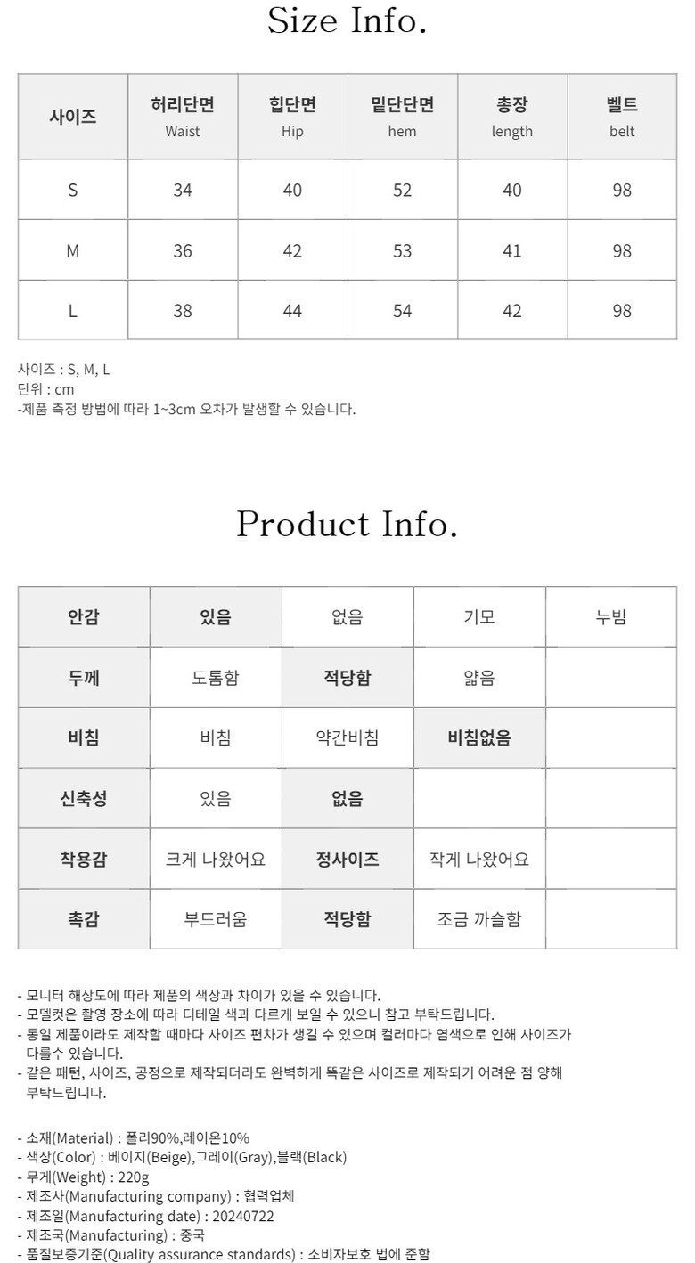 베이직한 디자인의 깔끔한 A라인 플리츠 미니 스커트와 벨트가 세트인 상품이에요! 깔끔하게 떨어지는 핏으로 어디에나 잘 어울리며 내장된 속바지로 Y존 부각 걱정없이 입을 수 있어 추천해요~! ※속바지가 내장되어 있는 상품입니다. ※벨트 탈부착 가능한 상품입니다. 컬러는 총 3가지 베이지(Beige),그레이(Gray),블랙(Black) 컬러로 준비했습니다. 사이즈는 S,M,L 사이즈로 상세사이즈를 확인하셔서 굿초이스해주세요 :) MD.DJ ※같은 사이즈라도 체형에 따라 핏감이 조금씩 다를 수 있습니다.