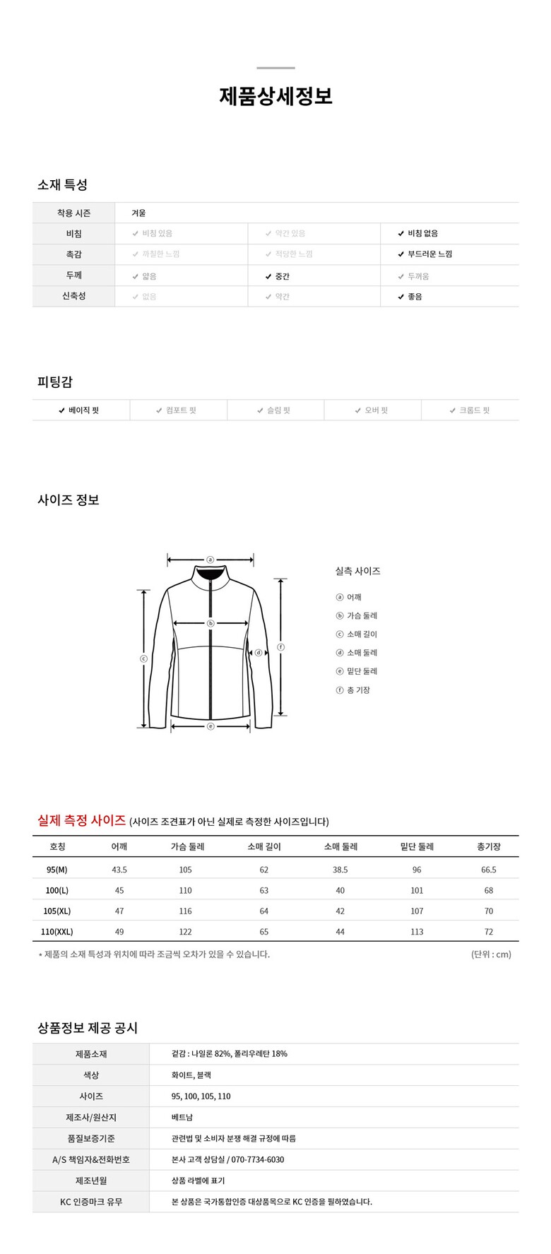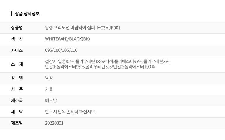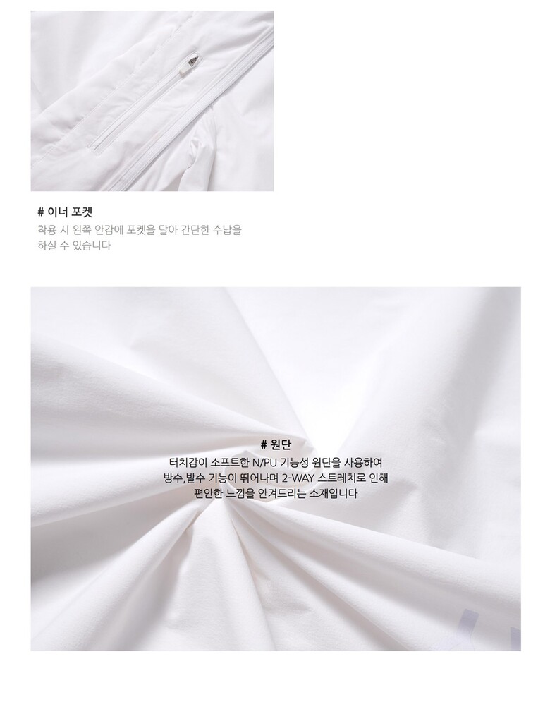 | 1. 제품 소재 (섬유의 조성 또는 혼용률을 백분율로 표시, 기능성인 경우 성적서 또는 허가서) | 겉감:나일론82%,폴리우레탄18%/배색:폴리에스터97%,폴리우레탄3%/안감1:폴리에스터95%,폴리우레탄5%/안감2:폴리에스터100% |
