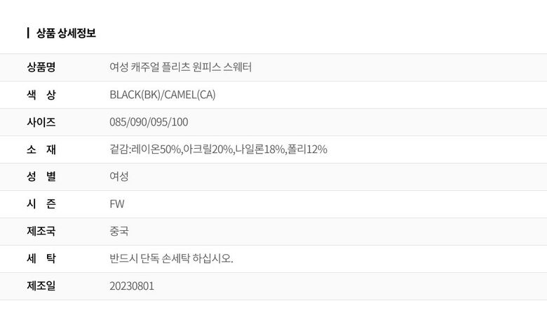 | 1. 제품 소재 (섬유의 조성 또는 혼용률을 백분율로 표시, 기능성인 경우 성적서 또는 허가서) | 겉감:레이온50%,아크릴20%,나일론18%,폴리12% |