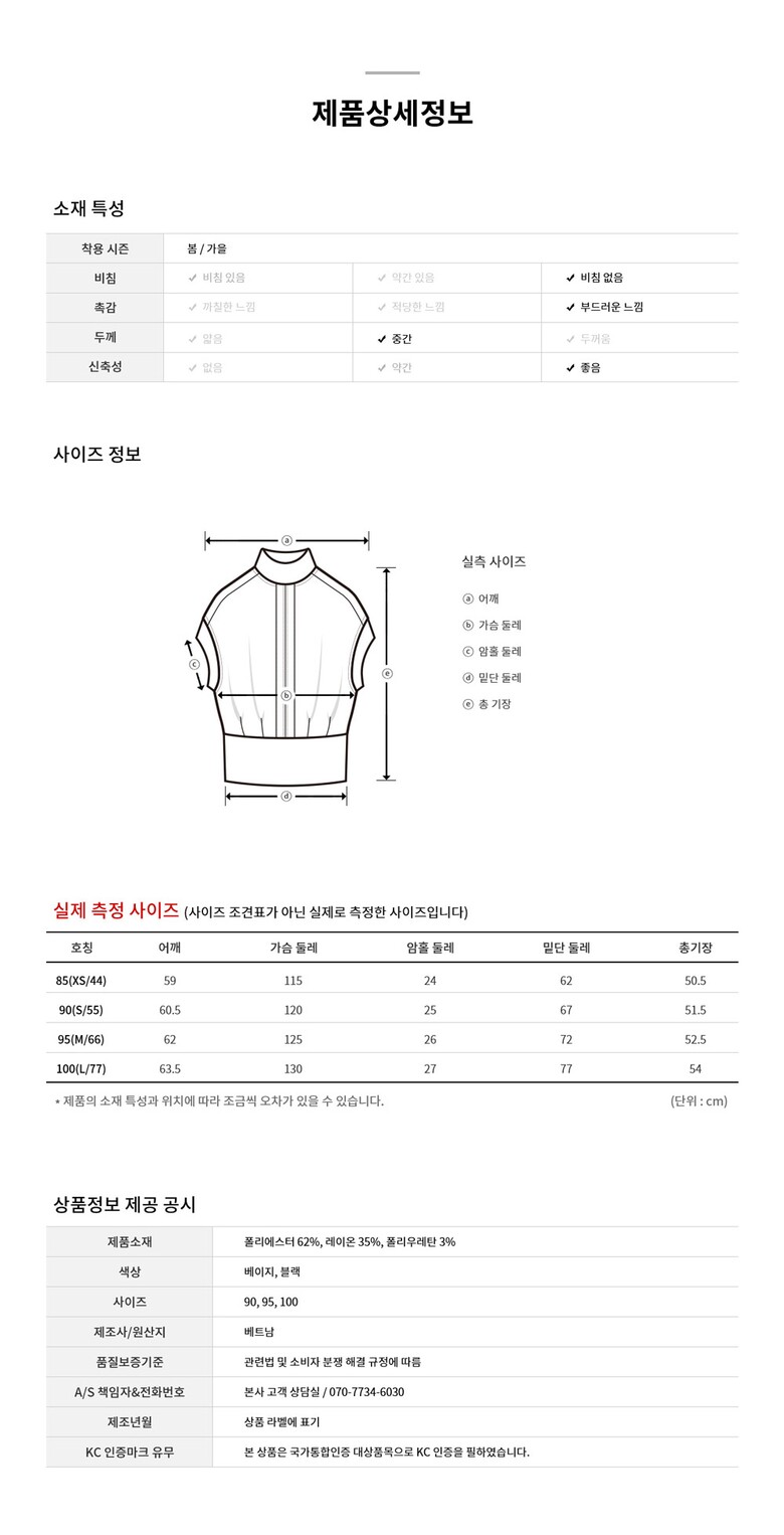 | 1. 제품 소재 (섬유의 조성 또는 혼용률을 백분율로 표시, 기능성인 경우 성적서 또는 허가서) | 폴리에스터62%,레이온35%,폴리우레탄3% |