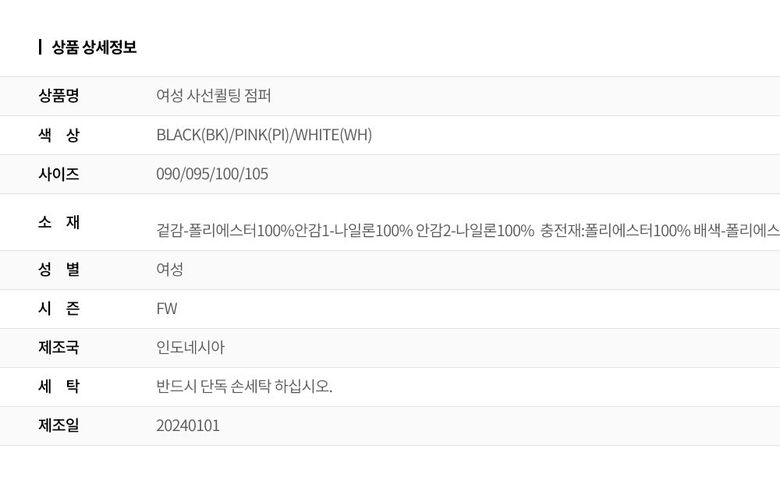 1. 제품 소재 (섬유의 조성 또는 혼용률을 백분율로 표시, 기능성인 경우 성적서 또는 허가서) | 겉감-폴리에스터100%안감1-나일론100% 안감2-나일론100% 충전재:폴리에스터100% 배색-폴리에스터95%폴리우레탄5% |