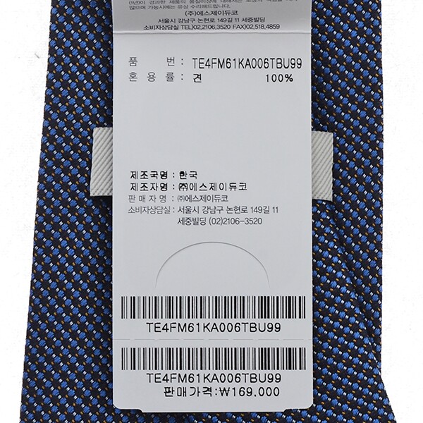 | 6. 취급시 주의사항 | -넥타이 보관시 매듭을 풀고 보관해 주십시요.-구김이 가지 않도록 길게 걸어두시는것이 좋습니다.-니트 타이의 경우, 장기간 걸어두시면 늘어날 수 있습니다. -둥글게 말아서 보관해 주십시요. - 접어서 보관하실 경우, 모양이 망가질 수 있으니 피해 주십시요.-물세탁시 제품의 광택 및 색상이 감소될 우려가 있습니다. -세탁시 사용시 모양이 망가질 수 있습니다. |