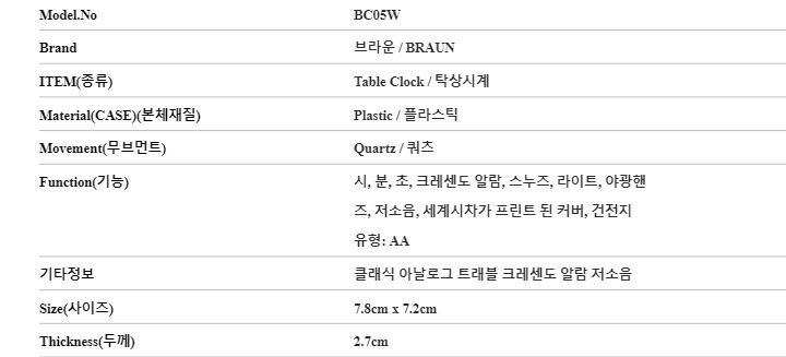 7. 주요 사양 | 플라스틱 탁상시계 쿼츠 |