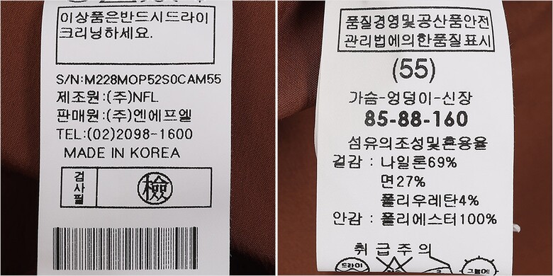 | 1. 제품 소재 (섬유의 조성 또는 혼용률을 백분율로 표시, 기능성인 경우 성적서 또는 허가서) | 겉감-면27% 폴리우레탄4% 나일론69% 안감-폴리에스터100% |