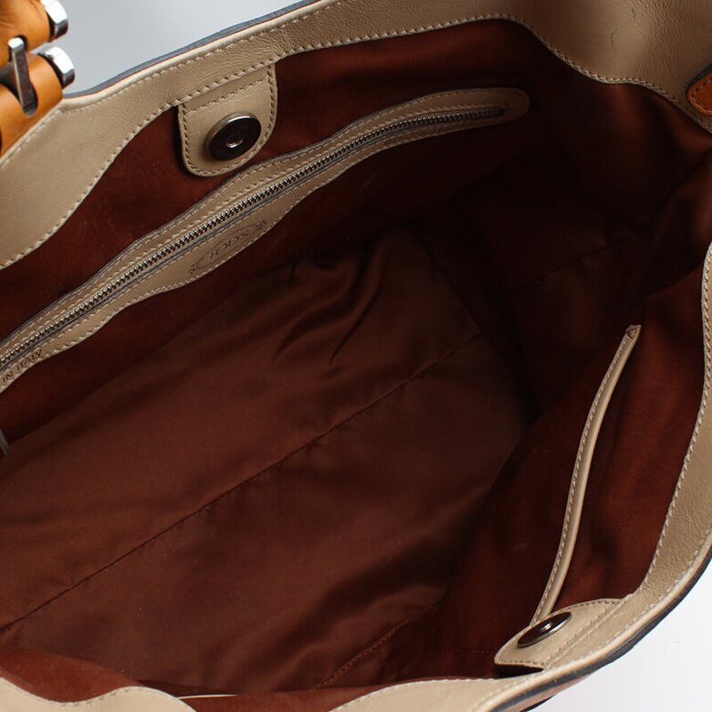 내부: 브라운 패브릭 라이닝 가벼운 사용감. 지퍼포켓 1개, 오픈포켓 2개.