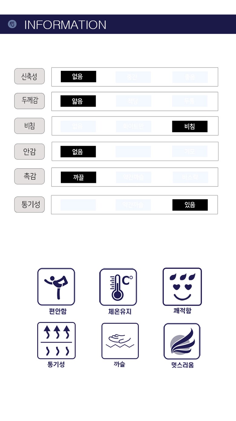 1. 제품 소재 (섬유의 조성 또는 혼용률을 백분율로 표시, 기능성인 경우 성적서 또는 허가서) 상세설명참고