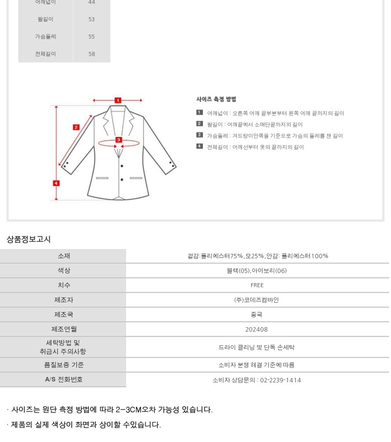 6. 세탁방법 및 취급시 주의사항 단독 드라이크리닝 또는 케어라벨 참조