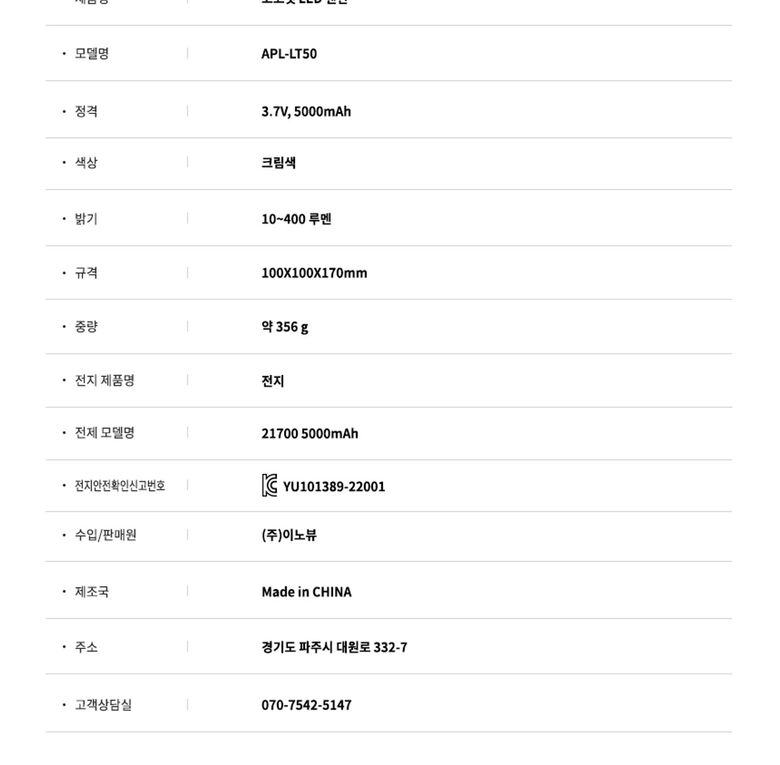 1. 품명 및 모델명 | 코코넛 LED 랜턴 APL-LT50 |