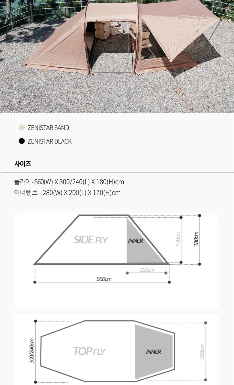 2. 크기, 중량 | 플라이 : 560(W) X 300/240(L) X 180(H) cm / 8.15kg 이너 : 280(W) X 200(L) X 170(H) cm |