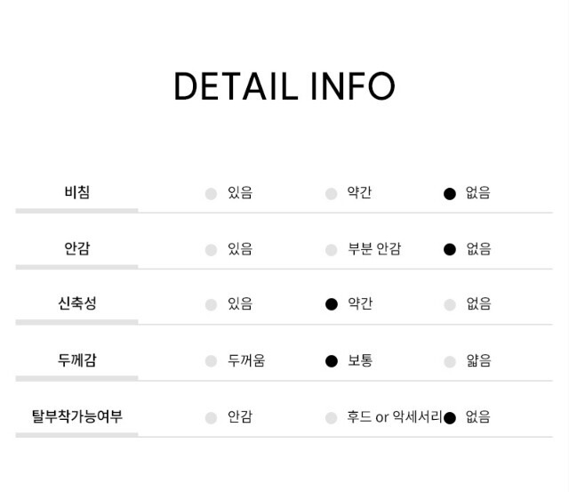 | 1. 제품 소재 (섬유의 조성 또는 혼용률을 백분율로 표시, 기능성인 경우 성적서 또는 허가서) | 상품상세참조 |