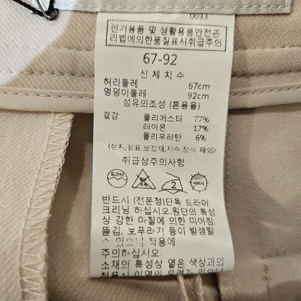 제품소재 : 겉감-폴리에스터77%, 레이온17%, 폴리우레탄4%
