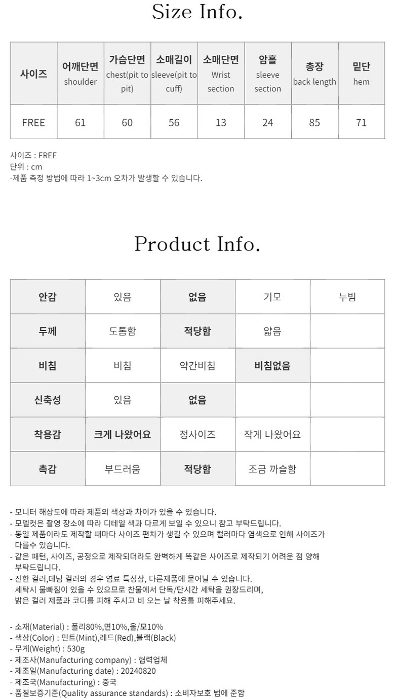 - FABRIC(소재) : 폴리80%,면10%,울/모10%