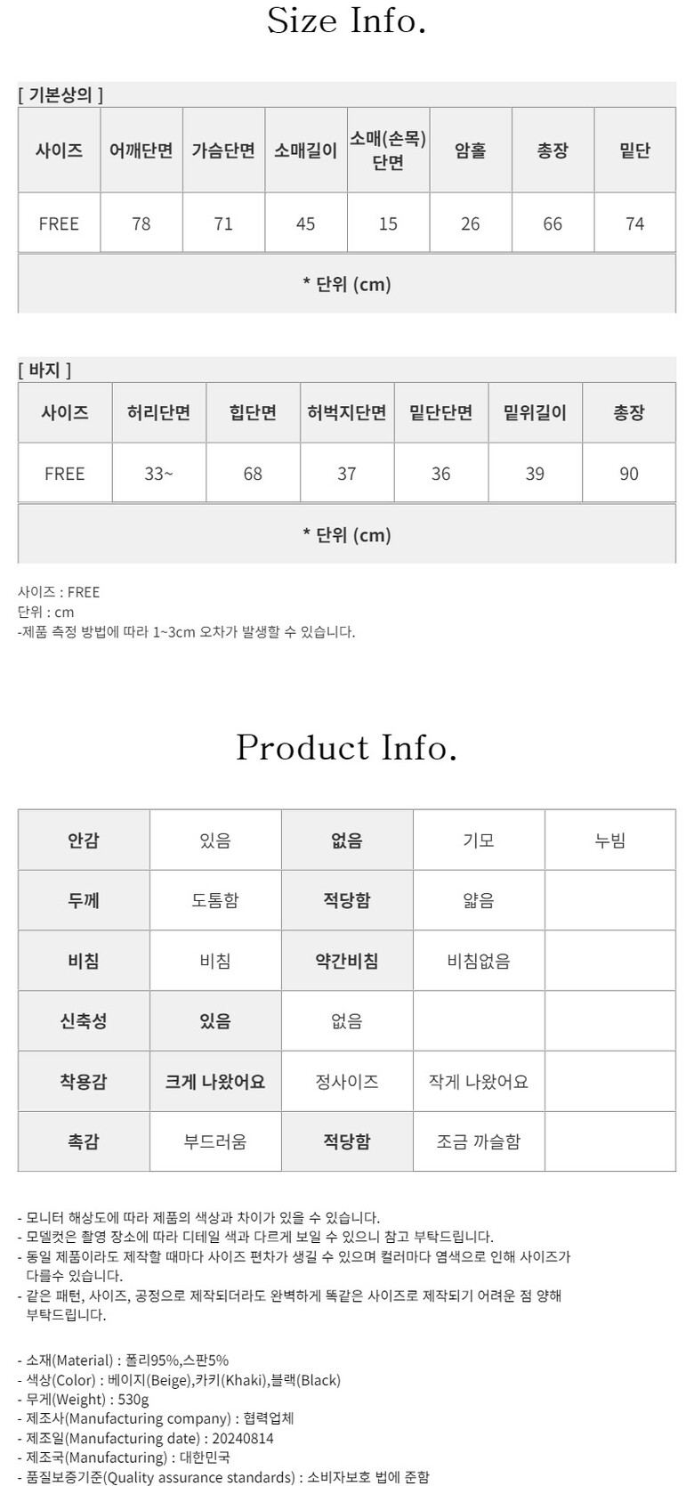 [ 기본상의 ] 어깨단면 / 가슴단면 / 소매길이 / 소매(손목)단면 / 암홀 / 총장 / 밑단 (FREE)78 / 71 / 45 / 15 / 26 / 66 / 74 [ 바지 ] 허리단면 / 힙단면 / 허벅지단면 / 밑단단면 / 밑위길이 / 총장 (FREE)33~ / 68 / 37 / 36 / 39 / 90