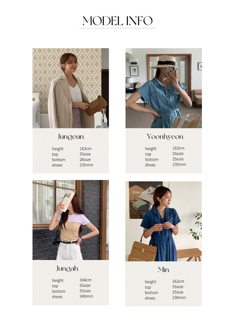 Top 44 / Bust 70A / Pants 26-27 / Height 162cm / Shoes 230 size