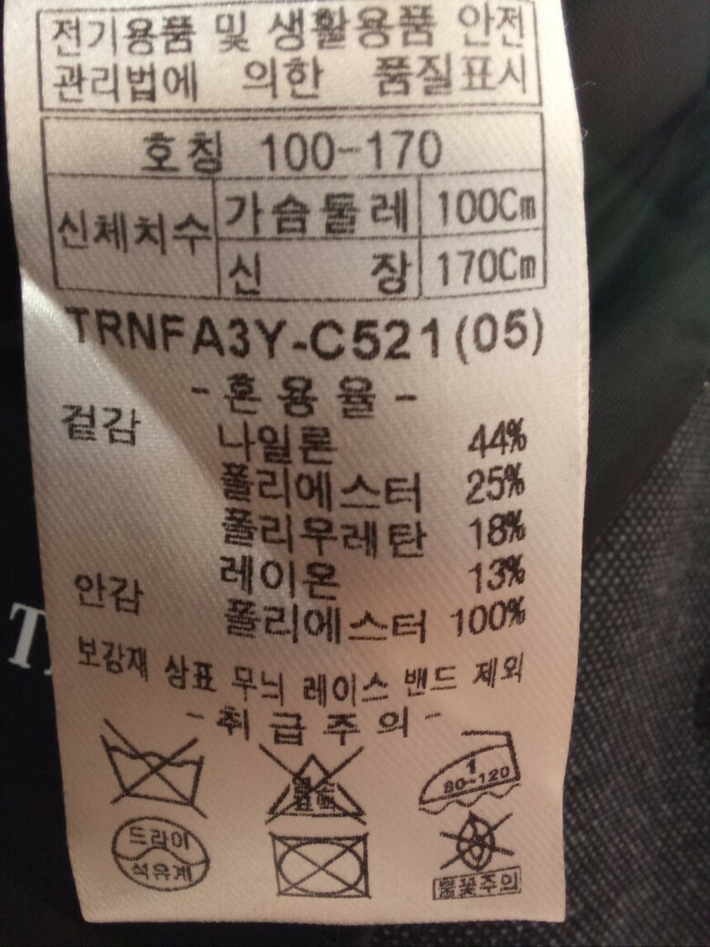 | 1. 제품 소재 (섬유의 조성 또는 혼용률을 백분율로 표시, 기능성인 경우 성적서 또는 허가서) | 겉감:나일론 44%, 폴리에스테르 25%, 폴리우레탄 18%, 레이온 13% / |