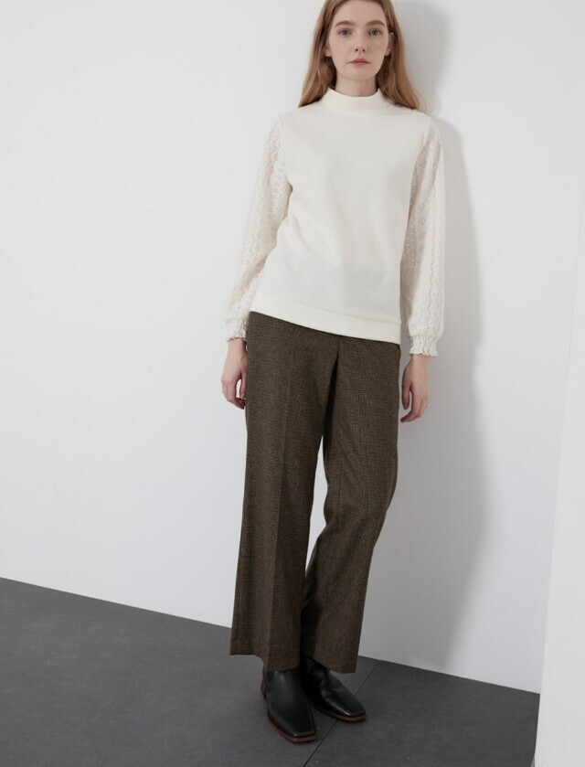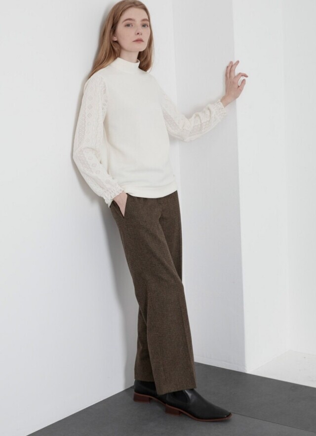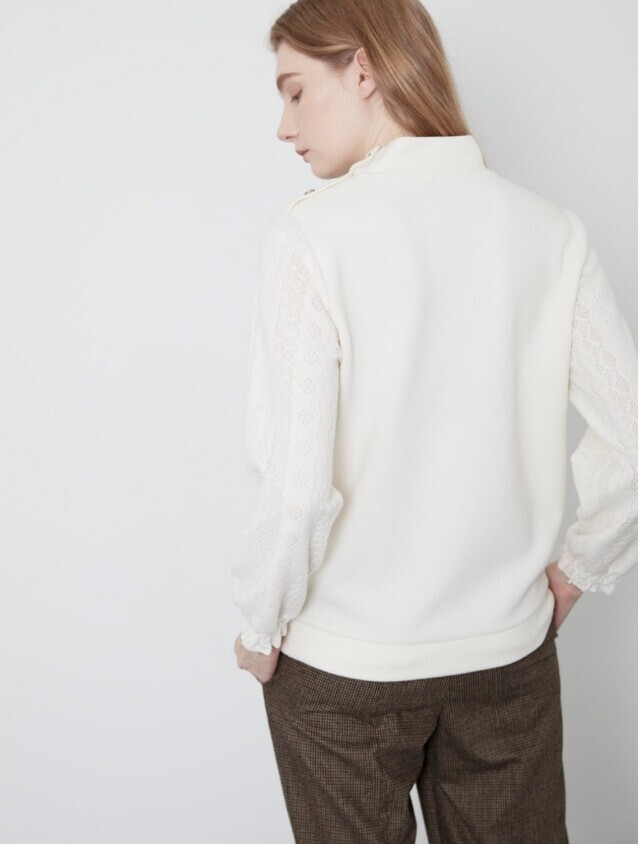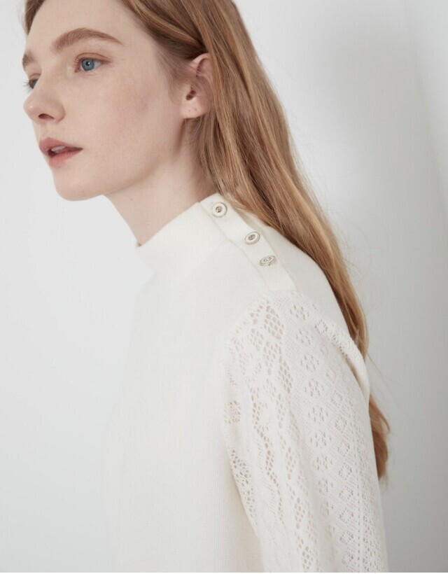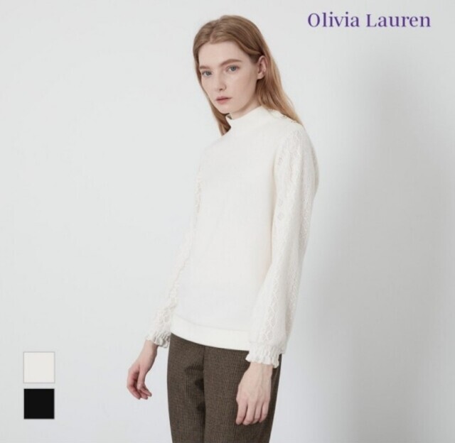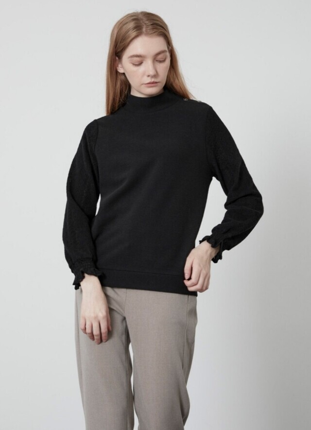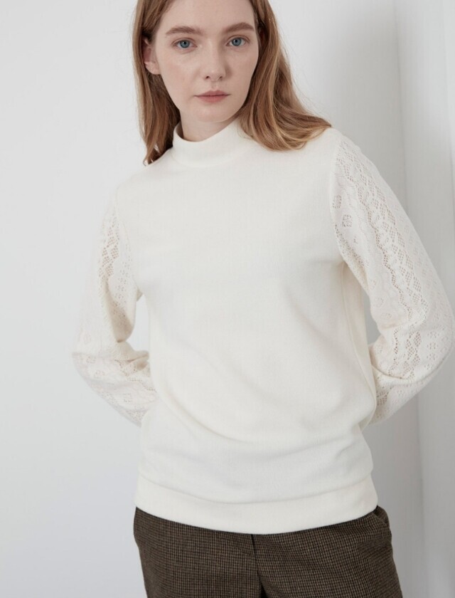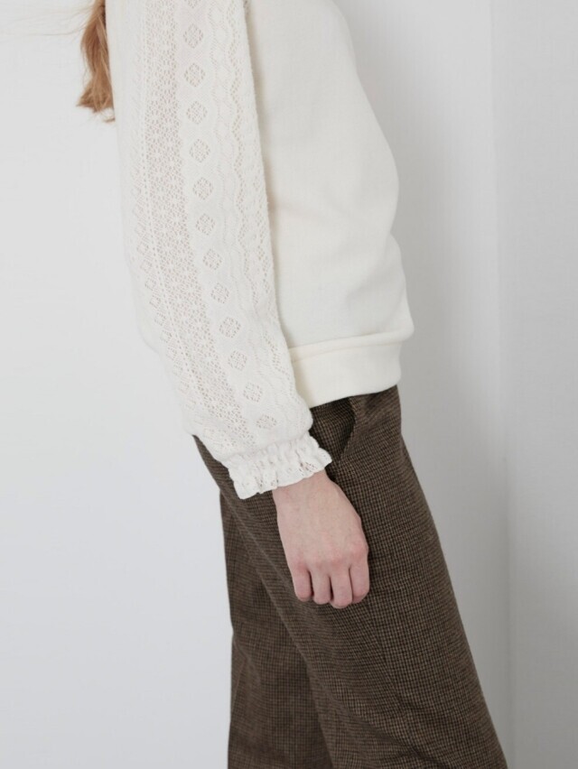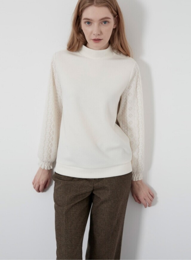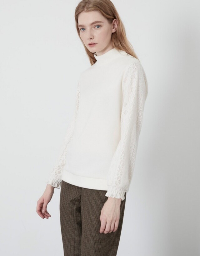 소매부분에 레이스 원단을 패치한 페미니한 스타일의