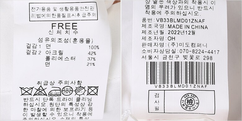 | 1. 제품 소재 (섬유의 조성 또는 혼용률을 백분율로 표시, 기능성인 경우 성적서 또는 허가서) | 겉감1-면100% 겉감2-아크릴42%폴리에스터37%면21% |