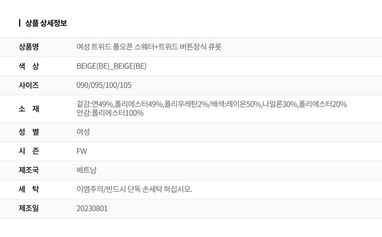 [1+1 SET] 여성 트위드 풀오픈 스웨터+트위드 버튼장식 큐롯