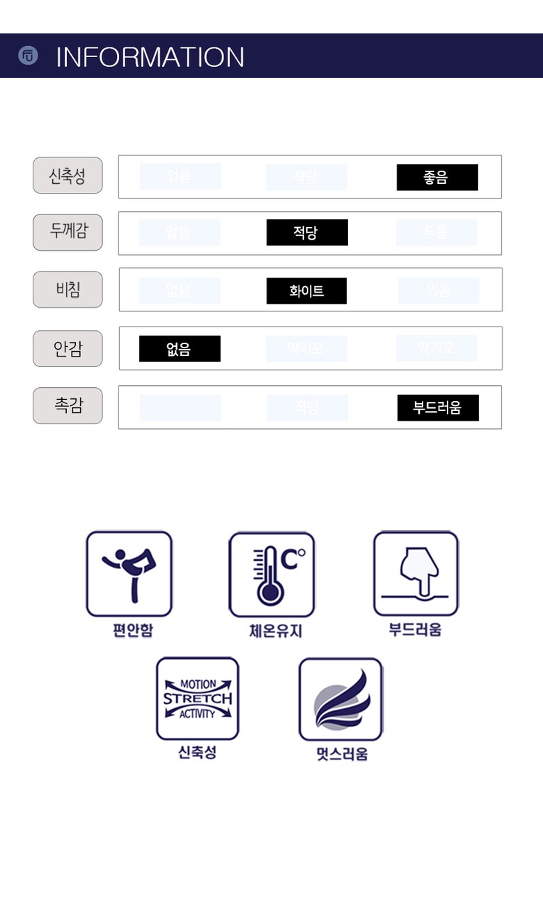 | 1. 제품 소재 (섬유의 조성 또는 혼용률을 백분율로 표시, 기능성인 경우 성적서 또는 허가서) | 상세설명참고 |