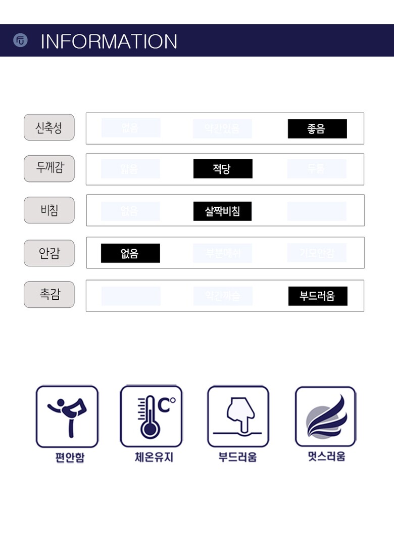| 1. 제품 소재 (섬유의 조성 또는 혼용률을 백분율로 표시, 기능성인 경우 성적서 또는 허가서) | 상세설명참고 |