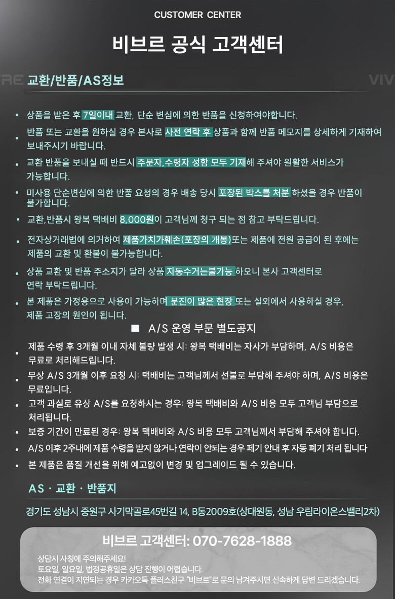 | 11. A/S책임자와전화번호 | 비브르고객센터 : 070-7628-1888 |