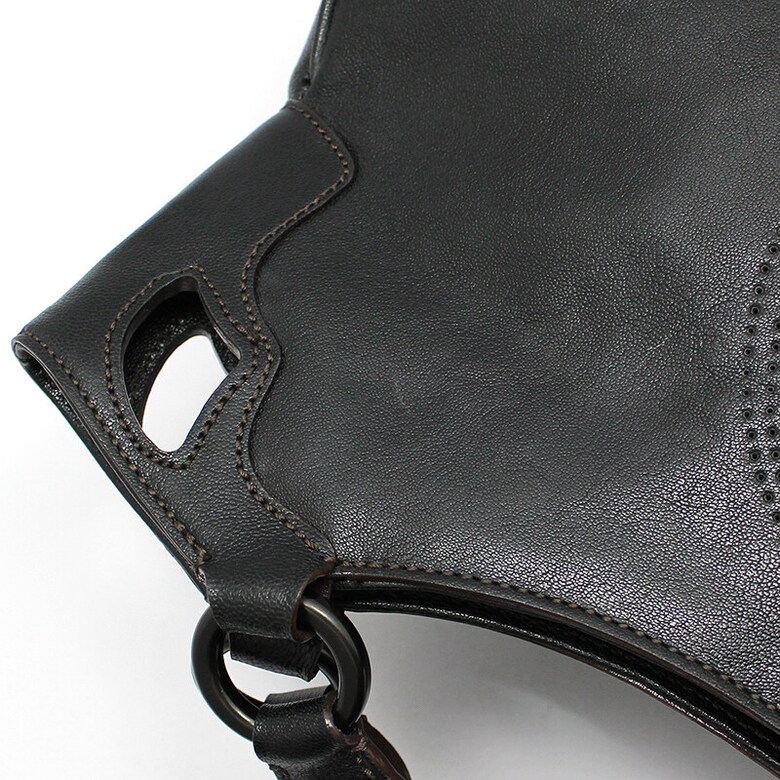 - 고급스러운 블랙 가죽 소재에 전면 로고 펀칭 디테일이 더해진 아이템입니다.